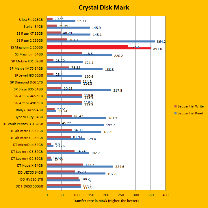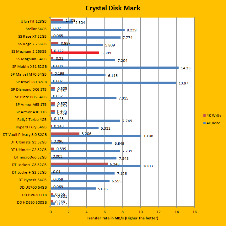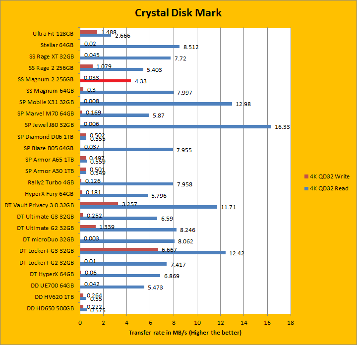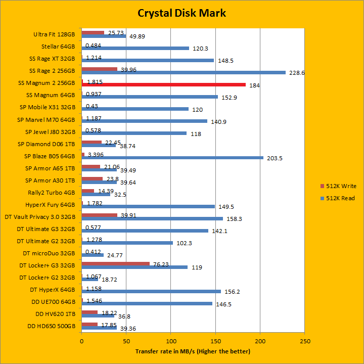 The Patriot Supersonic Magnum 2 256GB continued to deliver interesting results as we move into our Crystal Disk Mark sequential read and write results. In the Sequential Read and Sequential Write sections, although the Patriot Supersonic Rage 2 256GB edged out the Magnum 2 slightly in the read portion, the Magnum 2 was a real hit in the write portion. At 275.3MB/s, it was simply untouched by anything we have ever tested here at APH Networks. Its 512K read performance was also very good; unfortunately it was 512K write result was quite poor, especially for a performance flash drive. Scoring 1.815MB/s in a test where the Supersonic Rage 2 pulled 39.96MB/s was quite an embarrassment. As we move into the 4K and 4K QD32 territory, which requires high input/out operations per second (Commonly referred to as IOPS), the Patriot Supersonic Magnum 2 256GB was about mid-pack for read, and consistently near the bottom for write. In some cases, it was not even as good as the original Magnum. Generally speaking, the Patriot Supersonic Magnum 2 256GB was a real champ in sequential tests, but more complicated or demanding workloads exposed its weaknesses.