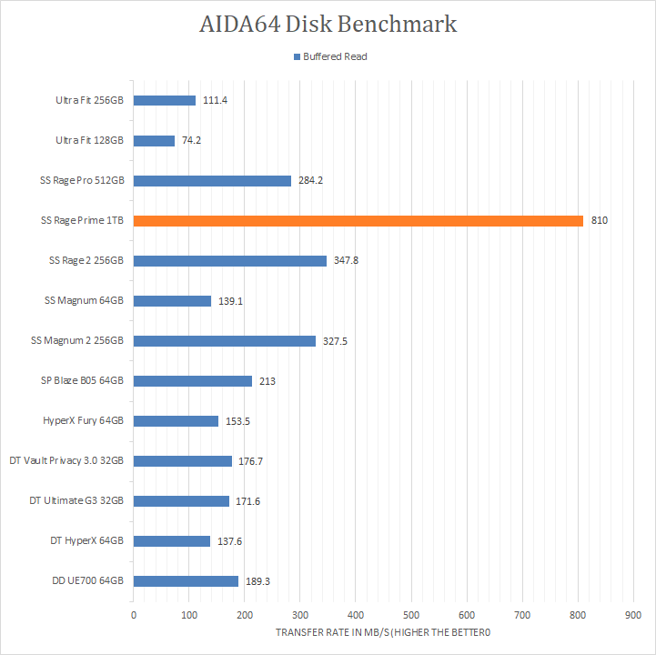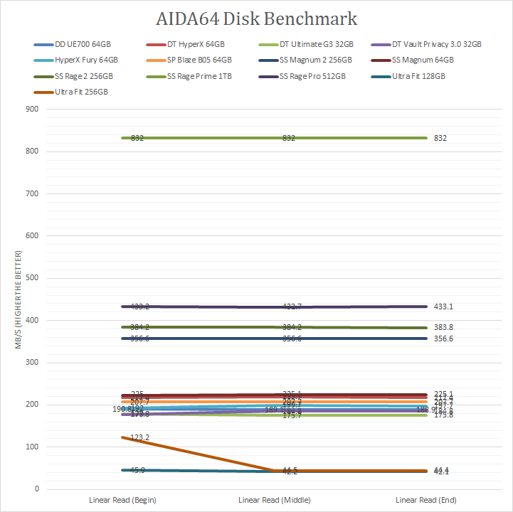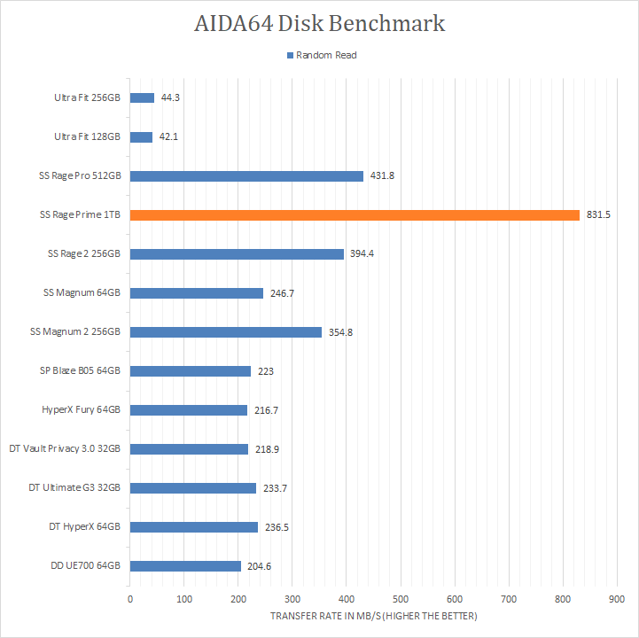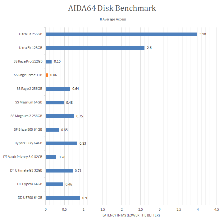 Since our USB flash drive review benchmark results are presented in alphabetical order, first up on the list are results from one of our favorite benchmarking programs, AIDA64 Engineer. Version 6.33.5700, the latest release at press time, can be downloaded from our Downloads page. Just to note, AIDA64 Engineer is a full synthetic benchmark. Unlike full synthetic motor oil, this usually does not always carry a good connotation. It does provide valuable insight into performance between different drives and different controllers while it is not a representation of real-life performance, such as how fast you can install a Windows image from it. Delivering up to 832.0MB/s sequential read, 831.5MB/s random read, and 810.0MB/s buffered read, this is by far the fastest USB flash drive on the list. In fact, it is so fast, it is faster than the Crucial X6 2TB solid state drive. Its 0.06 ms random access time was also by far the best among all compared drives. So far, for 1TB of USB 3.2 Gen 2 storage, this is some serious speed.