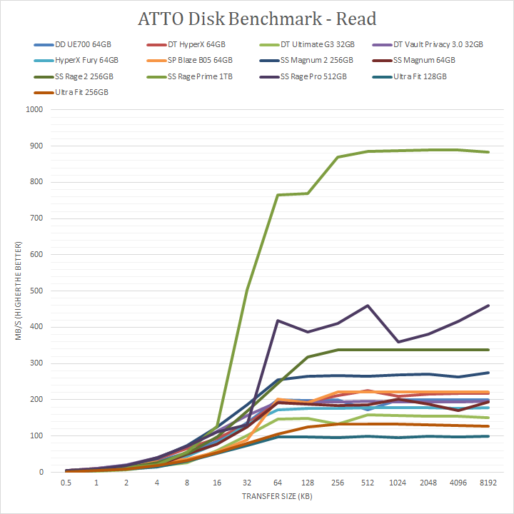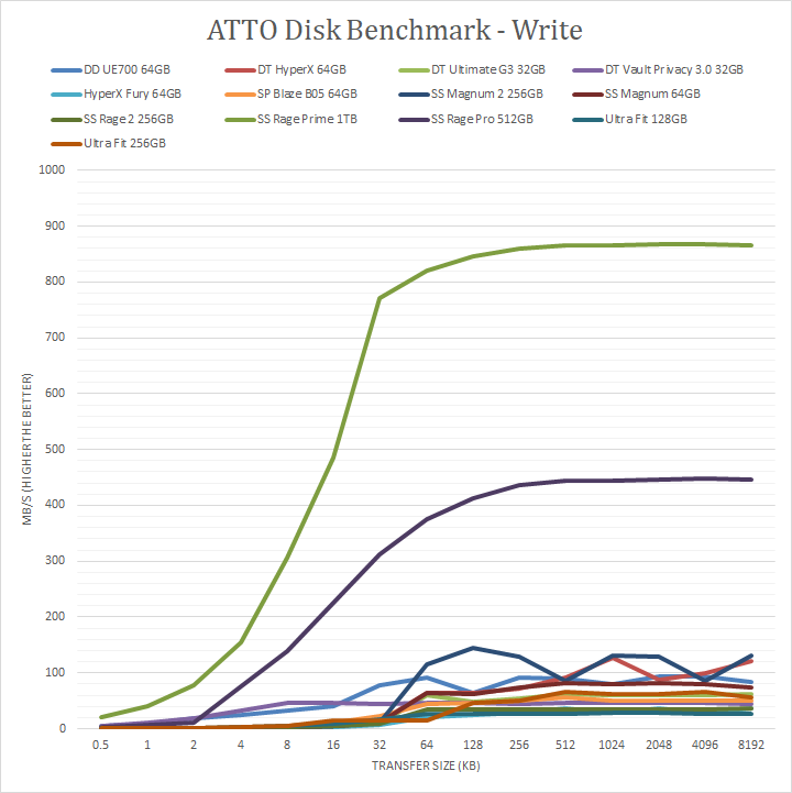Following up next are our usual ATTO read and write tests. ATTO is an often-quoted benchmark because it is easy to use and accurate. For the most part, it is a favorite among reviewers, and I have grown to embrace it as much as the next for the last little while. As manufacturer peak read and write performance ratings are usually achievable using ATTO, whether a drive lives up to its marketing claims or not can be validated by this program. Patriot claims the Supersonic Rage Prime 1TB's maximum read is pinned at 600MB/s. The Patriot Supersonic Rage Prime 1TB's read performance and write performance were both extremely fast as you can see in our graphs above; peaking at 889.33MB/s for read and 867.8MB/s for write. The tested read and write figures were way beyond the advertised speed, which made me double take. Under the curve, the Supersonic Rage Prime 1TB reached close to maximum performance for everything 64K and above. Both its write ramp up speed and peak write speed was, once again, considerably faster than any USB flash drive as demonstrated in the posted comparison charts. Its read speed was pretty average compared to other performance USB flash drives, but it was untouchable at 32K and above. This is very impressive and with the league of even portable SSDs.