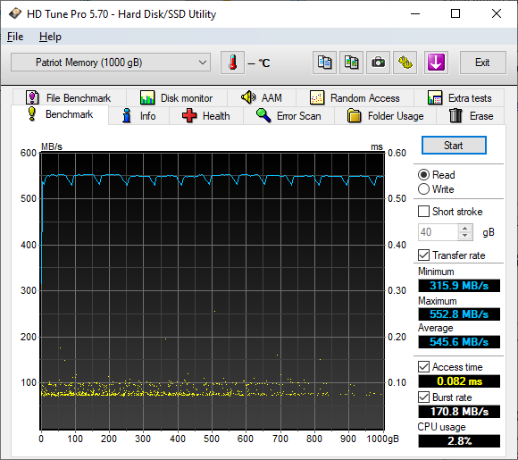 Unfortunately, HD Tune does not generate any fancy independent graph outputs in particular, so I just took a screenshot of the program. The Patriot Supersonic Rage Prime 1TB remained very flat on average. It differed slightly in magnitude than HD Tach -- probably due to testing algorithms used -- but its performance characteristics were identical in practice. Other than that, the results were very good across the range; the recorded access time was very low. The Supersonic Rage Prime 1TB posted an average of 545.6MB/s for its sequential read speed, which is, again, measurably faster than SSDs like the Crucial X8 1TB at 327.5MB/s and LaCie Rugged SSD 1TB at 367.3MB/s. No USB flash drive even comes close. The Patriot Supersonic Rage Prime 1TB's tested latency was slightly different compared to AIDA64 and HD Tach at 0.082 ms. Do keep in mind the discussion we had on the previous page, as it still applies here.