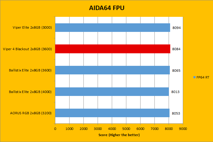 The next tests we have are AIDA64's FPU benchmarks, which are usually the least exciting of all when writing a RAM review. This is because the results obtained are generally more dependent on the tested processor. The outcome of these results is almost irrelevant to the speed or latencies of the installed memory modules. As you can see in our graphs above, all the results were within one percent of each other. As for the Patriot Viper 4 Blackout DDR4-3600 2x8GB dual channel kit, it scored in at second place for most of the tests. At the end of the day, they were all within the same ballpark as each other, so these differences do not amount too much.