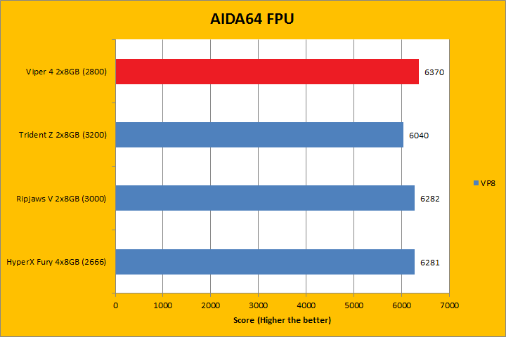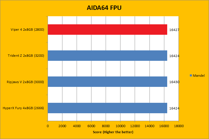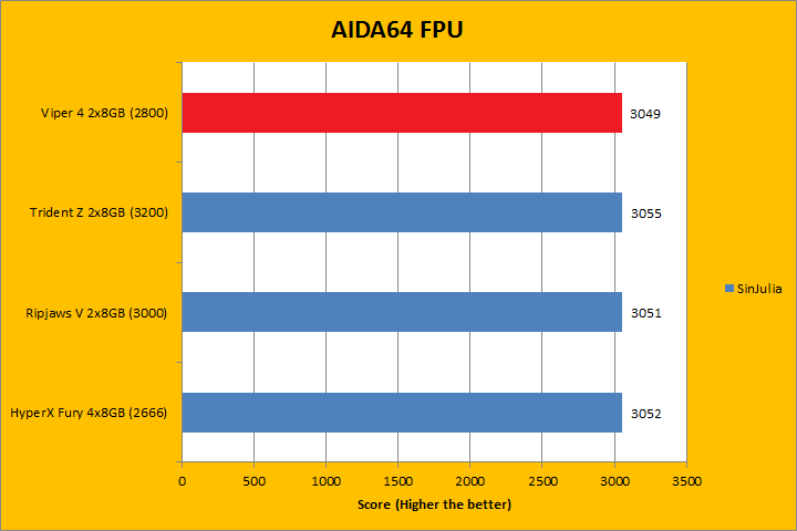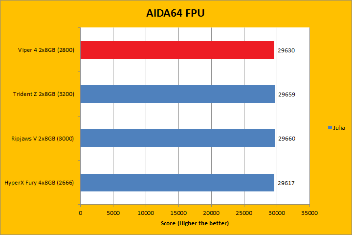 Usually, AIDA64's FPU benchmarks are the least exciting of all when writing a RAM review. This is because the way results are obtained is usually highly dependent on the tested processor; so much to an extent that the outcome is practically irrelevant to the speed or latencies of the installed memory modules. As you can see in our graphs above, all the results were within a fraction of a percent of each other. In the case of Patriot's Viper 4 PC4-22400 2x8GB dual channel kit, it was within a hair of the competition in practically every test. Generally speaking, we can call it all a statistical tie.