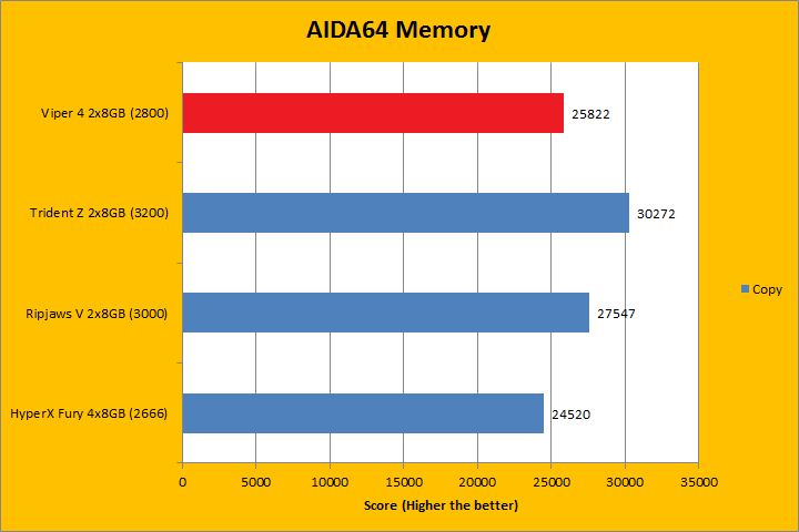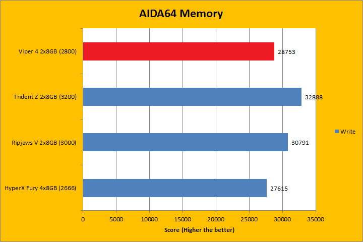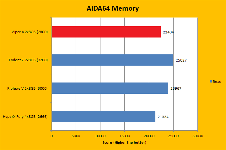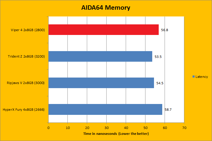 AIDA64's synthetic memory tests are the one next up to produce results for our review today. In pretty much all the benchmarks, we can see higher memory bandwidth RAM kits are generally favored -- whether it is the Copy, Write, or Read results. This was probably the most unsurprising thing ever, consider the name of this benchmark does, in fact, reflect what was tested. Operating at DDR4-2800, the Patriot Viper 4 PC4-22400 2x8GB came in at third place for every test, because first place went to the DDR4-3200 set, while second place went to the DDR4-3000 set. This was pretty much what we have been expecting all along.