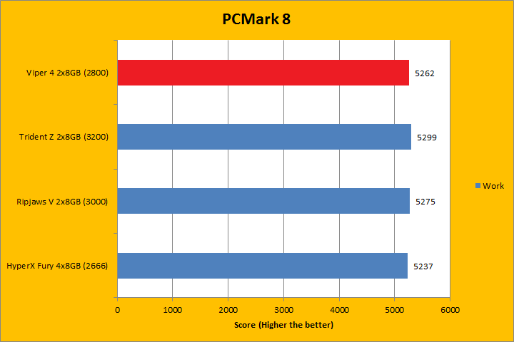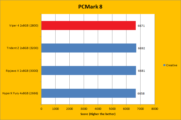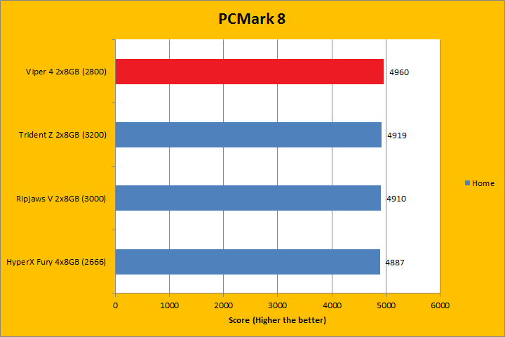 PCMark 8 is the latest revision of the popular full system benchmark from Futuremark. It tests five general categories, which includes Home, Creative, Work, Storage, and Applications. In order to run the Applications benchmark, you must have Adobe Creative Suite and Microsoft Office installed. We do have those programs here at APH Networks, but this is a test platform, so we do not have extra licenses to go around just for benchmarking purposes. As such, I left them out of my results. I did not run the Storage suite, because we are testing a memory kit here. With PCMark 8 fired up, all tests were run in Accelerated mode, where available. All tested RAM came out to be extremely close. If we were to go by absolute values, however, higher bandwidth memory scored marginally higher, so the Patriot Viper 4 PC4-22400 2x8GB at DDR4-2800 had some disadvantages except for the first test. Do keep in mind the differences were virtually negligible.