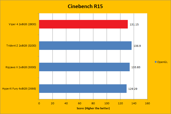 Cinebench R15 is separated into two tests: One tests the CPU image rendering performance, while the other benchmarks the OpenGL video rendering performance. Obviously, having a fast processor and a powerful video card, respectively, will play a much more significant role in determining these scores, but that does not mean RAM does not do anything at all to contribute to these results. As you can see in our charts above, the Patriot Viper 4 PC4-22400 2x8GB did well in both tests; holding its own against faster and slower kits in the CPU and OpenGL results. That said, it is important to point out all of the tested kits came out extremely close to each other, despite frequency variance of approximately 534MHz between the fastest and slowest.