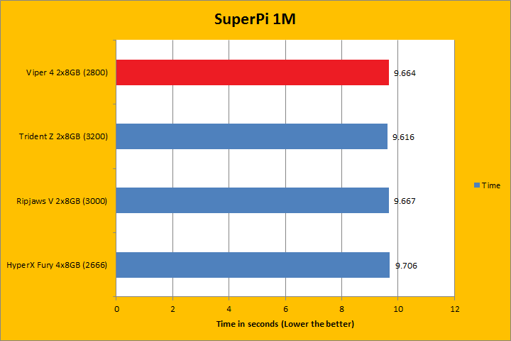We have always included SuperPi in our benchmark results, because it is a quick and dirty run that always proves to be interesting. It is neither the fastest way to calculate Pi, nor is it the most challenging. But being an enthusiast at heart, this program has always provided interesting results for showing off your overclocking prowess at your favorite online forum. This time around, the Patriot Viper 4 PC4-22400 2x8GB lost by a small fraction of a second against the fastest, but only because it was tested against faster memory modules -- and second place is not a bad place to be.