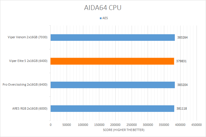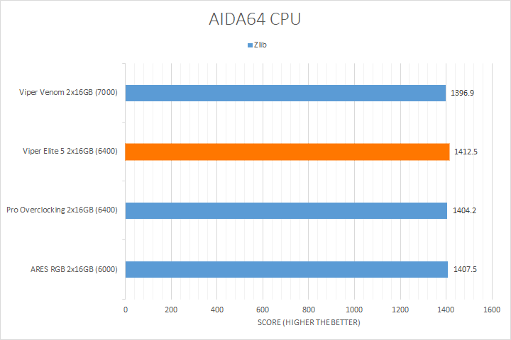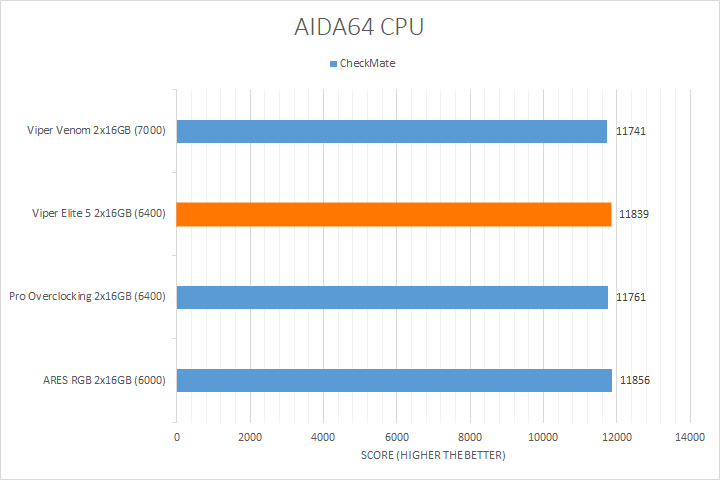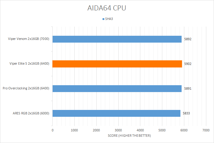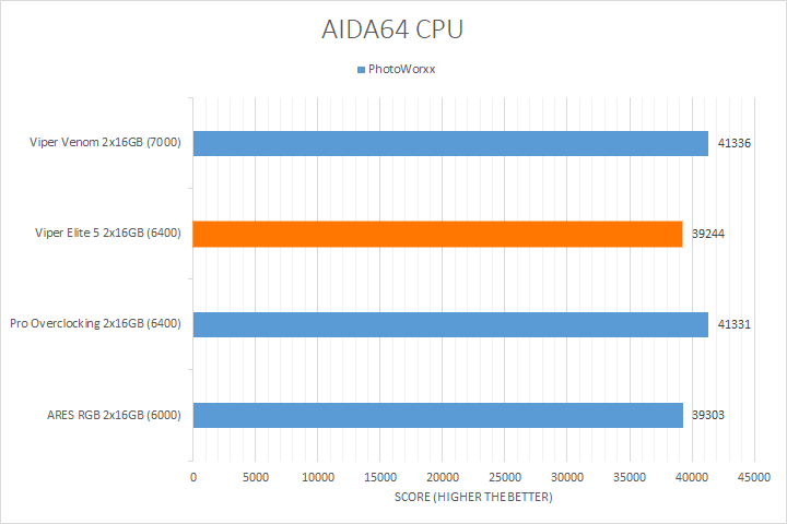 In the first set of AIDA64 tests, the CPU benchmarks, most of the DDR5 memory kits performed similarly to each other and the results were within 1% of each other. The one exception to this was PhotoWorxx, where the results slightly correlated with the operating transfer speeds of the memory, although this was not fully the case either. As for the Patriot Viper Elite 5 DDR5-6400, we had mixed results across the board. It achieved second in CheckMate, last in PhotoWorxx, first in Zlib, last in AES, and first in SHA3. However, the variations between the results were not significant enough to draw definitive conclusions about the Patriot Viper Elite 5 modules, whether positive or negative. Overall, the tests indicated that all these kits were close with each other, with only minor differences across four of the five tests.