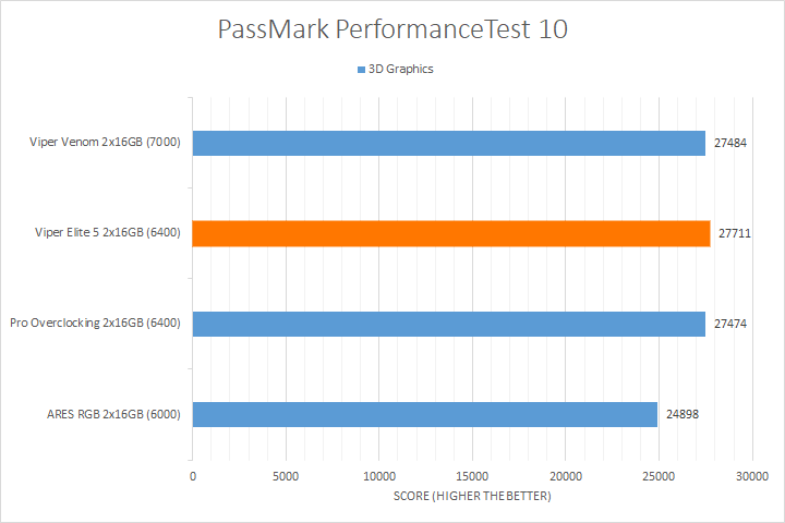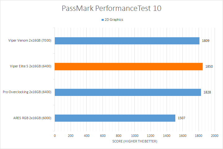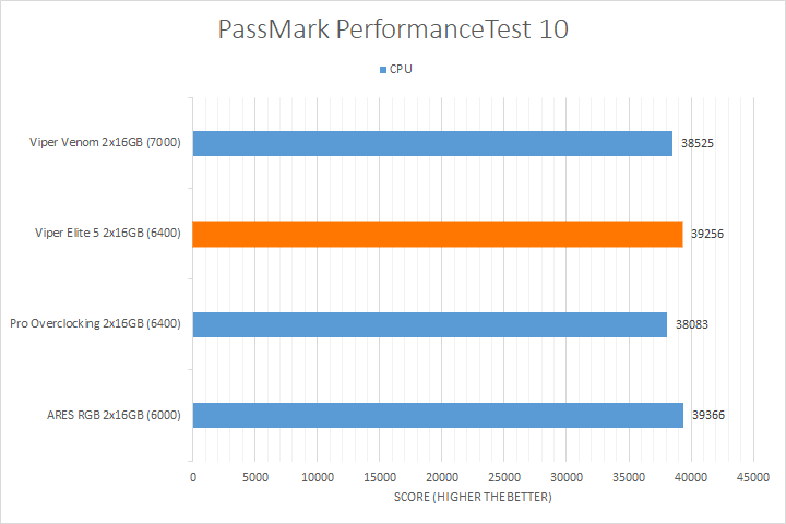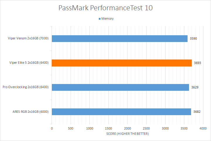 PassMark PerformanceTest 11 is another valuable tool for evaluating various aspects of system performance, including CPU, RAM, 2D Graphics, and 3D Graphics. It takes a unique approach in obtaining results compared to other programs, making it a good supplementary benchmarking program. PassMark Performance Test 11's memory benchmarking tool is the only test in our setup that takes memory capacity into account. However, since all the kits assessed are 32GB in total capacity, this point becomes irrelevant. The memory benchmarks did account for the differences in data transfer rates, with the benchmark showing better results in the 6000 to 6400MT/s range. The performance from the Patriot Viper Elite 5 aligned with the results from other tests.