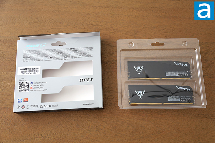 I have always found Patriot's retail memory packaging to be interesting, and the latest Viper Elite 5 Ultra is no exception. As you can see in our photo above, the Patriot Viper Elite 5 Ultra's retail box design is quite large for a memory kit. I am a big fan of products that come in an actual retail box. The silver background is clean, while a photo of the dual channel kit occupies the majority of the real estate up front. The red Viper Gaming logo is located at the upper left-hand corner. Meanwhile, on the upper right corner of the box, you will find a label indicating its capacity, configuration, and speed. Our particular variant is the non-RGB version as its name suggests, but an RGB version is also available. The Elite 5 Ultra DDR5 Memory branding in reflective silver text is at the bottom. An Ultra Compatible badge is located near the bottom right corner. If you want to take a look at the RAM itself, two parallel windows show off the modules at the back.