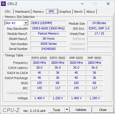 A screenshot of the memory tab in CPU-Z with Patriot's Viper Elite 5 Ultra DDR5-6000 2x24GB installed. The SPD timings table in CPU-Z reads standard JEDEC specifications programmed into the memory as well as XMP data for running the memory at various speeds. Our ASUS ProArt Z890-Creator WiFi motherboard used for testing had no issues detecting and working with the Viper Elite 5 Ultra DDR5-6000 RAM right out of the box. The Patriot Viper Elite 5 Ultra DDR5-6000 2x24GB retails for approximately $560 at press time, but availability and price may vary significantly due to DDR5 supply issues.
