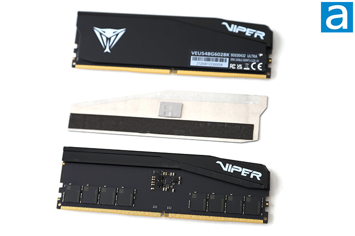 The heatspreader design of the Patriot Viper Elite 5 Ultra modules is asymmetrical when looked at straight on, but symmetrical between sides, which is logical, because memory can be installed in different directions depending on your motherboard manufacturer and design. Besides functional purposes, it also improves the look. The Viper logo is on one side with the branding on the other. Patriot's logo is not permanently etched anywhere at all like many of their latest products. A specification label is found on one side. It lists information like the model number, in this case, VEU548G6028K, bandwidth, CAS latency, voltage, and the kit's memory capacity. The Patriot Viper Elite 5 Ultra DDR5-6000 2x24GB is made in Taiwan.