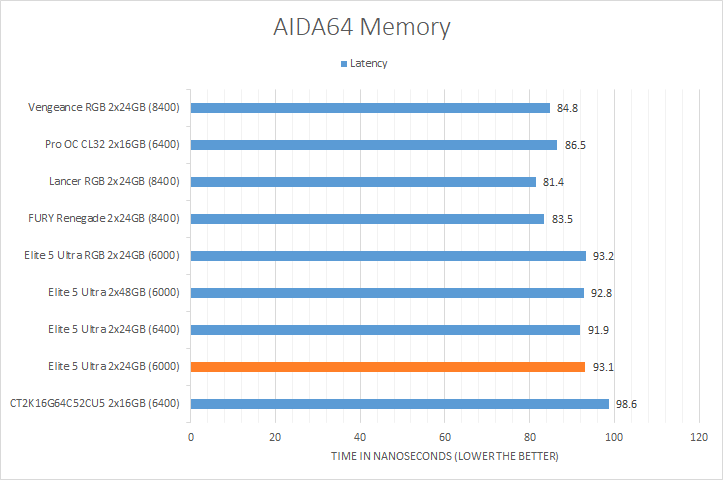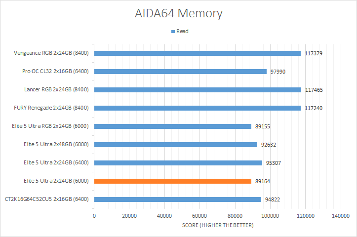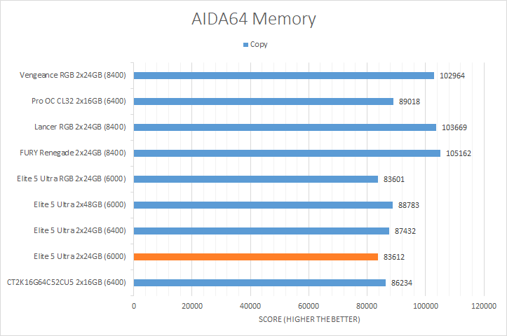 AIDA64's synthetic memory tests are the one next up to produce results for our review today. Traditionally, in pretty much all the benchmarks, higher memory bandwidth RAM kits are generally favored, whether it is the Copy, Write, or Read results. Operating at DDR5-6000, the Viper Elite 5 Ultra 2x24GB consistently came in the bottom of the charts, which was expected, given it is clocked among the lowest. Its score in the memory latency test was within expectations and similar to all the other Patriot Viper models.
