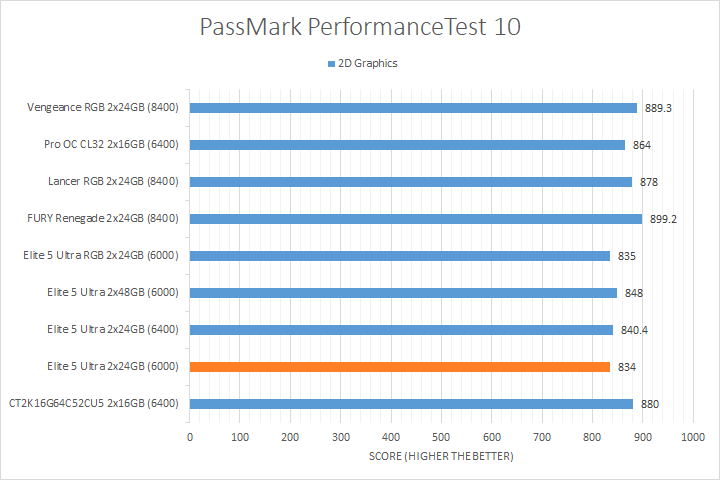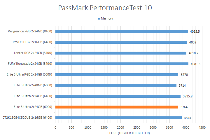 We run PassMark PerformanceTest 11 to evaluate four different areas of our system; coming down to the CPU, 2D Graphics, 3D Graphics, and RAM. It takes a somewhat different approach in obtaining results compared to other programs, which is why we like to use it. PassMark Performance Test 11's memory benchmarking tool is the only test in our setup that takes memory capacity into account, but it does not seem to account for anything above 16GB from our past experience. The memory benchmarking tool did account for the extra bandwidth, so faster RAM generally performed better. We also observed a measurable performance difference between the DDR5-8400 kits and most DDR5-6000/DDR5-6400 kits for the 2D Graphics and 3D Graphics Tests, as evident by the Patriot Viper Elite 5 Ultra DDR5-6000 2x24GB's position on the charts. Other than that, the CPU test was generally reasonably close between all tested memory.