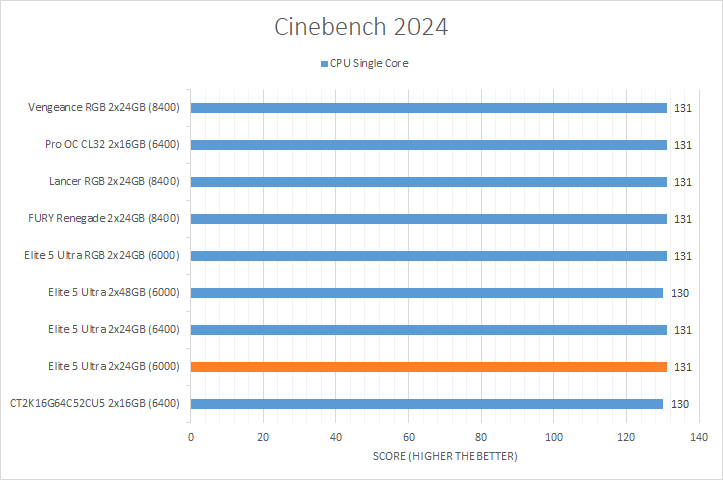 As you can see in our charts above, there was a measurable difference between different RAM models in the CPU Multi Core test, showing a discernible advantage for the DDR5-8400 kits. The Patriot Viper Elite 5 Ultra DDR5-6000 2x24GB came in near the back, which made sense given its rated bandwidth, but otherwise delivered competitive performance against other RAM in its performance class. In the CPU Single Core test, the performance for every tested product was basically identical.