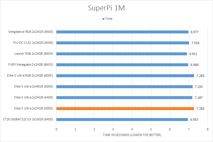 We have always included SuperPi in our benchmark results, because it is a quick and dirty run that always proves to be interesting. It is neither the fastest way to calculate Pi nor is it the most challenging. But being an enthusiast at heart, this program has always provided interesting results for showing off your overclocking prowess on your favorite online outlet. All the results regardless of model and bandwidth were within a hair of each other, but all the Patriot Viper kits were consistently slightly slower than the rest.