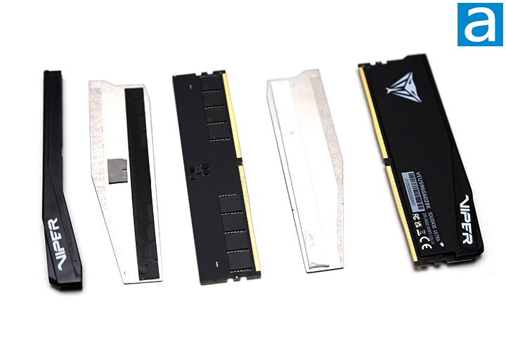The heatspreader design of the Patriot Viper Elite 5 Ultra modules is asymmetrical when looked at straight on, but symmetrical between sides, which is logical, because memory can be installed in different directions depending on your motherboard manufacturer and design. Besides functional purposes, it also improves the look. The Viper logo is on one side with the branding on the other. Patriot's logo is not permanently etched anywhere at all like many of their latest products. A specification label is found on one side. It lists information like the model number, in this case, VEU596G6028K, bandwidth, CAS latency, voltage, and the kit's memory capacity. The Patriot Viper Elite 5 Ultra DDR5-6000 2x48GB is made in Taiwan.