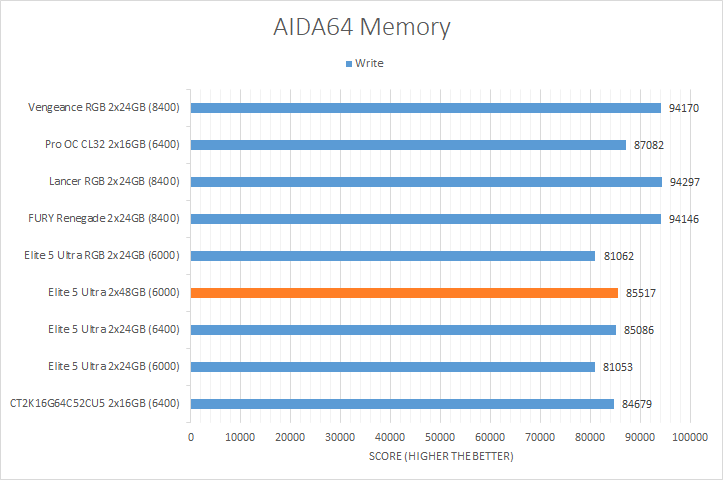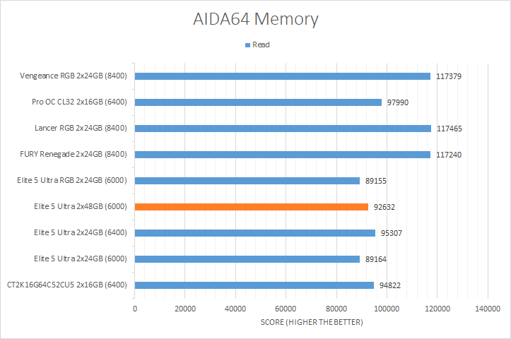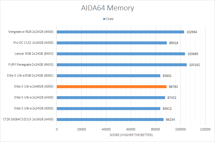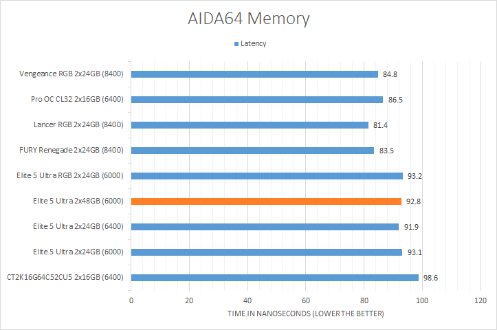 AIDA64's synthetic memory tests are the one next up to produce results for our review today. Traditionally, in pretty much all the benchmarks, higher memory bandwidth RAM kits are generally favored, whether it is the Copy, Write, or Read results. Operating at DDR5-6000, the Viper Elite 5 Ultra 2x48GB consistently came in the upper-middle of the charts, which was somewhat surprising, given it is clocked among the lowest. There was a good margin of advantage against the other two DDR5-6000 kits, and in many cases, against the other three DDR5-6400 kits, too. Its score in the memory latency test was within expectations and similar to all the other Patriot Viper models.