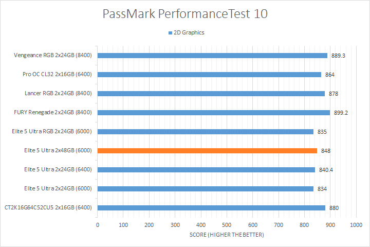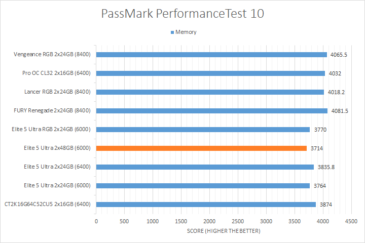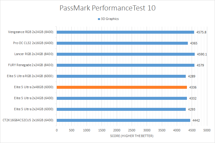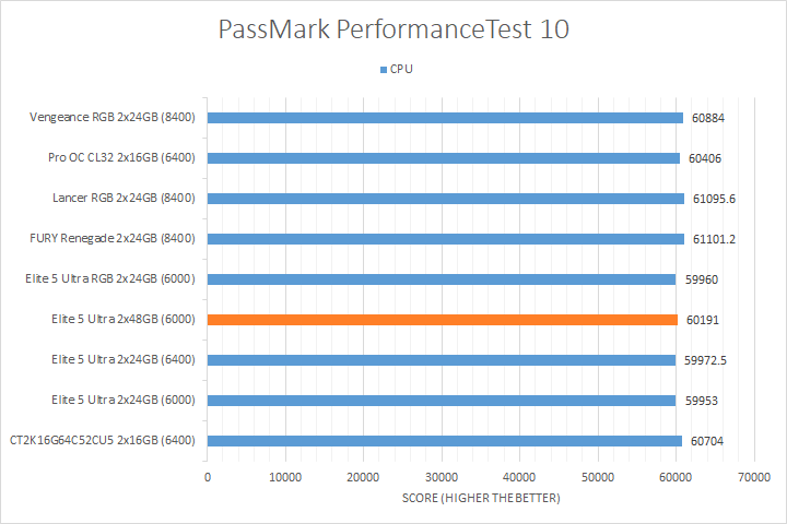 We run PassMark PerformanceTest 11 to evaluate four different areas of our system; coming down to the CPU, 2D Graphics, 3D Graphics, and RAM. It takes a somewhat different approach in obtaining results compared to other programs, which is why we like to use it. PassMark Performance Test 11's memory benchmarking tool is the only test in our setup that takes memory capacity into account, but it does not seem to account for anything above 16GB from our past experience. The memory benchmarking tool did account for the extra bandwidth, so faster RAM generally performed better. We also observed a measurable performance difference between the DDR5-8400 kits and most DDR5-6000/DDR5-6400 kits for the 2D Graphics and 3D Graphics Tests, as evident by the Patriot Viper Elite 5 Ultra DDR5-6000 2x48GB's position on the charts. Other than that, the CPU test was generally reasonably close between all tested memory.