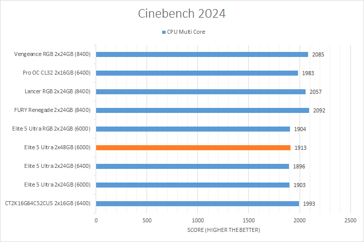 As you can see in our charts above, there was a measurable difference between different RAM models in the CPU Multi Core test, showing a discernible advantage for the DDR5-8400 kits. The Patriot Viper Elite 5 Ultra DDR5-6000 2x48GB came in near the back, which made sense given its rated bandwidth, but otherwise delivered competitive performance against other RAM in its performance class. In the CPU Single Core test, the performance for every tested product was basically identical.