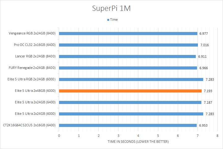 We have always included SuperPi in our benchmark results, because it is a quick and dirty run that always proves to be interesting. It is neither the fastest way to calculate Pi nor is it the most challenging. But being an enthusiast at heart, this program has always provided interesting results for showing off your overclocking prowess on your favorite online outlet. All the results regardless of model and bandwidth were within a hair of each other, but all the Patriot Viper kits were consistently slightly slower than the rest.