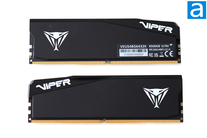 The heatspreader design of the Patriot Viper Elite 5 Ultra modules is asymmetrical when looked at straight on, but symmetrical between sides, which is logical, because memory can be installed in different directions depending on your motherboard manufacturer and design. Besides functional purposes, it also improves the look. The Viper logo is on one side with the branding on the other. Patriot's logo is not permanently etched anywhere at all like many of their latest products. A specification label is found on one side. It lists information like the model number, in this case, VEU548G6432K, bandwidth, CAS latency, voltage, and the kit's memory capacity. The Patriot Viper Elite 5 Ultra DDR5-6400 2x24GB is made in Taiwan.