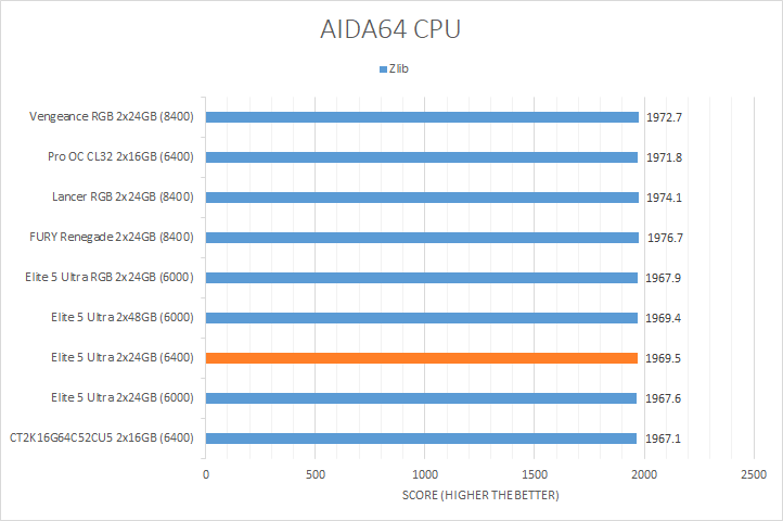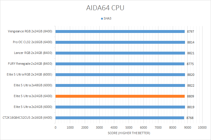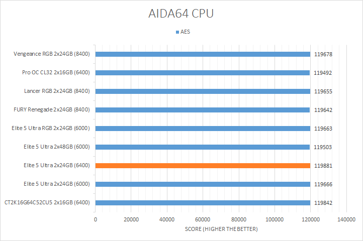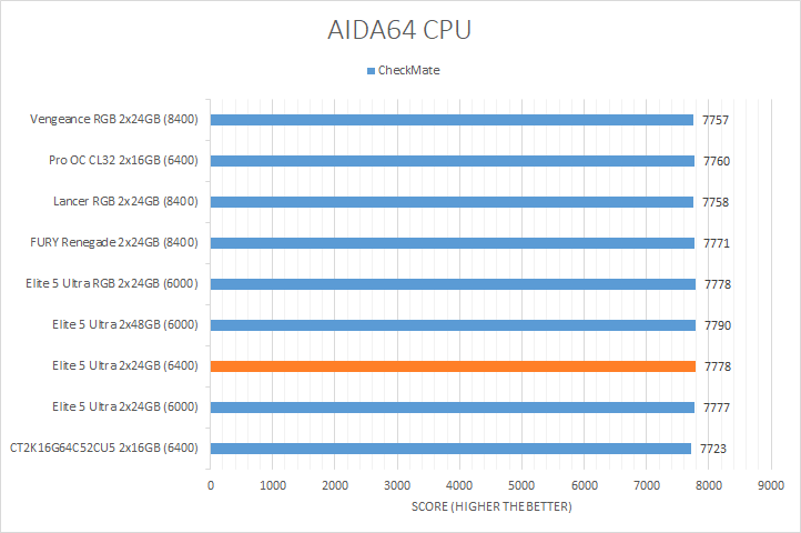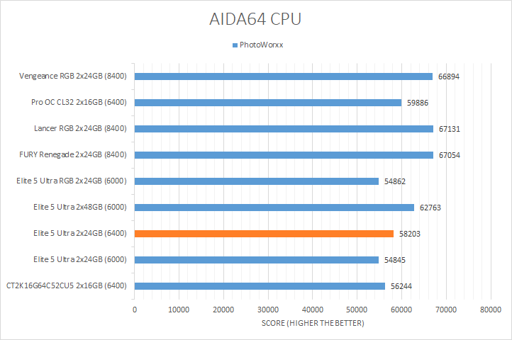 It was quite interesting how the products compared, because there is 2.4GHz between the fastest and slowest kit. As far as how their performance went, all of them were close to each other in most tests, with the Patriot Viper Elite 5 Ultra DDR5-6400 2x24GB sitting at where we expected it to be in relative to the compared kits. AIDA64 did not gain much from stepping up your memory speed with the exception of the PhotoWorxx results, where the DDR5-8400 kits occupied the upper end of the chart, while the DDR5-6400 Viper Elite 5 Ultra 2x24GB came in near the bottom, consistent with its speed rating.
