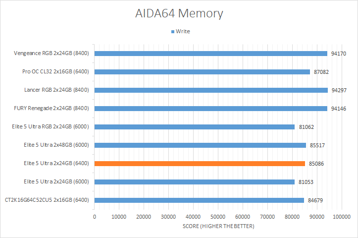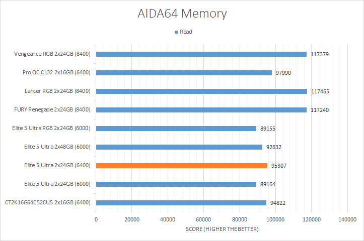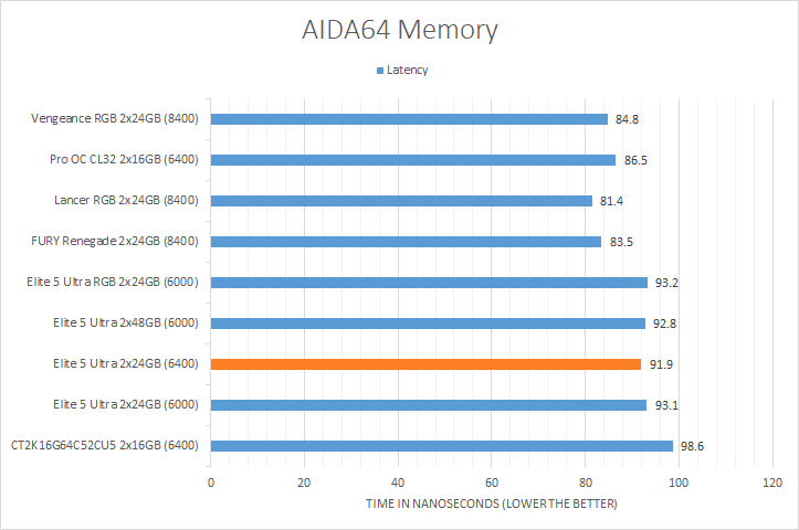 AIDA64's synthetic memory tests are the one next up to produce results for our review today. Traditionally, in pretty much all the benchmarks, higher memory bandwidth RAM kits are generally favored, whether it is the Copy, Write, or Read results. Operating at DDR5-6400, the Viper Elite 5 Ultra 2x24GB consistently came in the upper-middle of the charts, which is consistent with its speed rating. It scored a little bit lower than the Crucial Pro Overclocking CL32 DDR5-6400 2x16GB. Its score in the memory latency test was within expectations and similar to all the other Patriot Viper models.