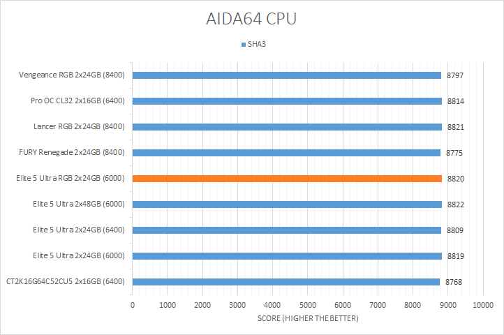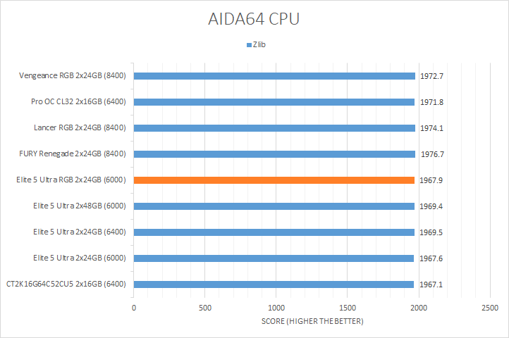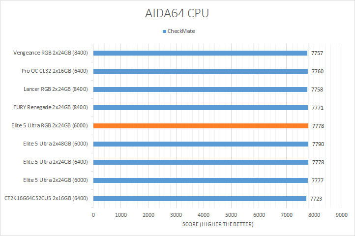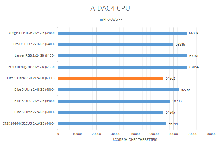 It was quite interesting how the products compared, because there is 2.4GHz between the fastest and slowest kit. As far as how their performance went, all of them were close to each other in most tests, with the Patriot Viper Elite 5 Ultra RGB DDR5-6000 2x24GB sitting at where we expected it to be in relative to the compared kits. AIDA64 did not gain much from stepping up your memory speed with the exception of the PhotoWorxx results, where the DDR5-8400 kits occupied the upper end of the chart, while the DDR5-6000 Patriot Viper Elite 5 Ultra RGB came in at the bottom, consistent with its speed rating.