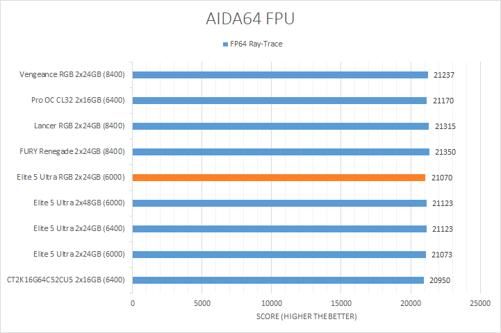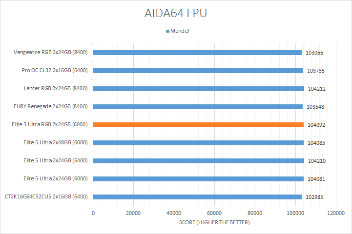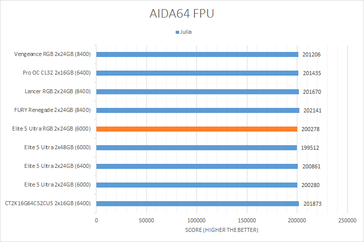 Usually, AIDA64's FPU benchmarks are the least exciting of all when writing a RAM review. This is because the way results are obtained is usually highly dependent on the tested processor, so much to an extent that the outcome is typically irrelevant to the speed or latencies of the installed memory modules. As you can see from our graphs above, all the results were within a few percent of each other.
