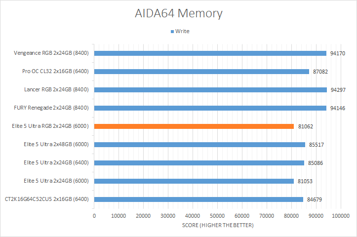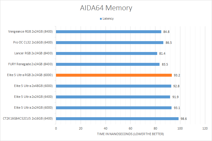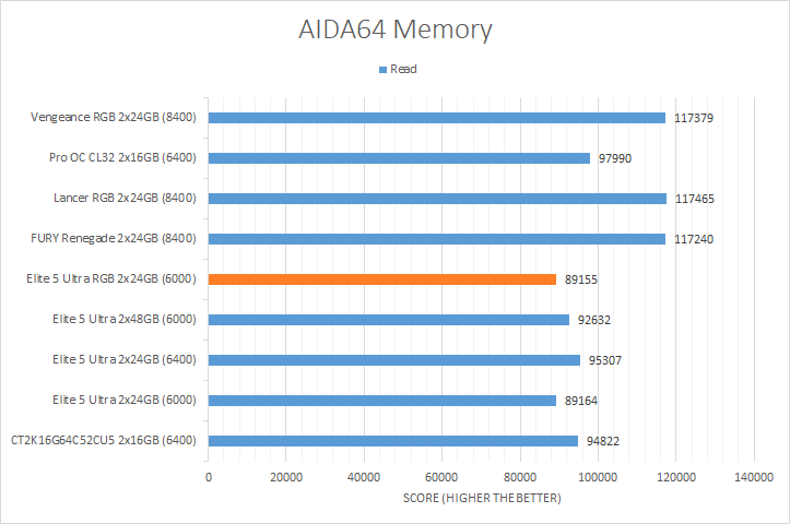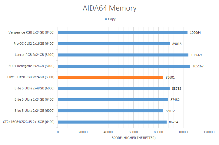 AIDA64's synthetic memory tests are the one next up to produce results for our review today. Traditionally, in pretty much all the benchmarks, higher memory bandwidth RAM kits are generally favored, whether it is the Copy, Write, or Read results. Operating at DDR5-6000, the Viper Elite 5 Ultra RGB 2x24GB consistently came in the bottom of the charts, which was expected, given it is clocked among the lowest. Its score in the memory latency test was within expectations and similar to all the other Patriot Viper models.