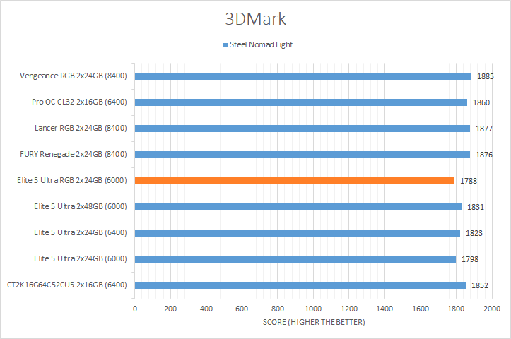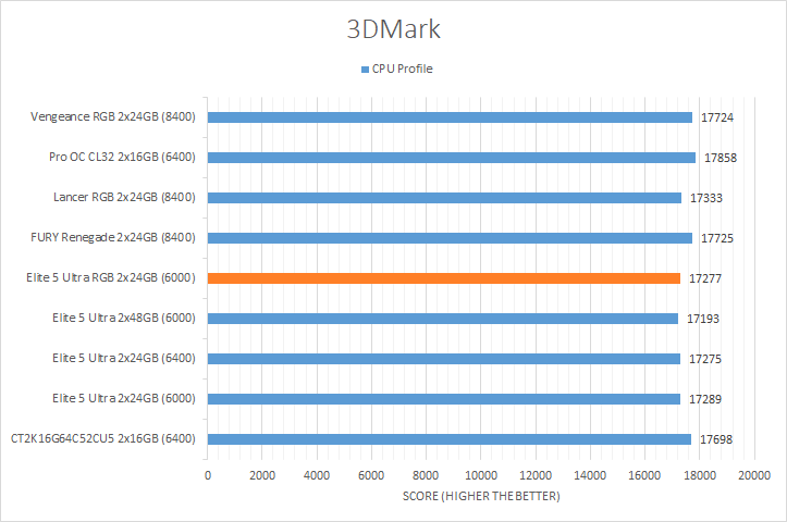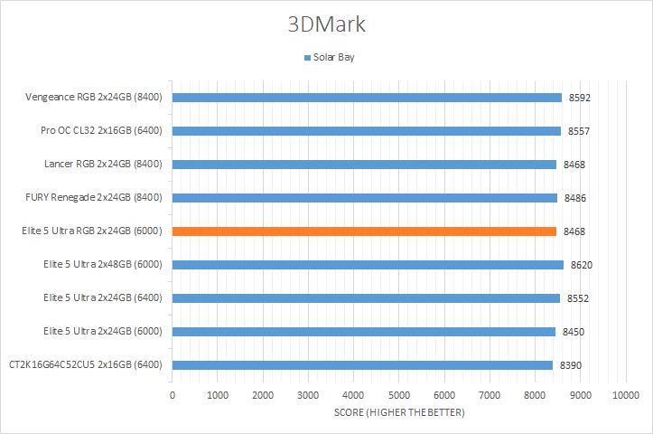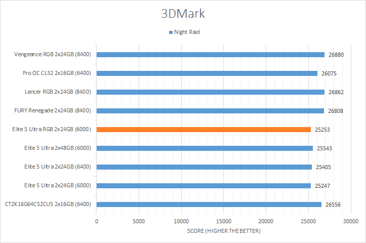 As you can see in our graphs above, all of the tested RAM, including the Patriot Viper Elite 5 Ultra RGB DDR5-6000 2x24GB we are reviewing today, showed a good degree of score variance, with some tests more than others. This demonstrates memory bandwidth played some role in most of these tests, with some more than others like Night Raid, where the DDR5-8400 kits clearly performed better that the rest.