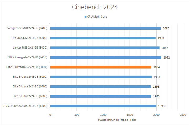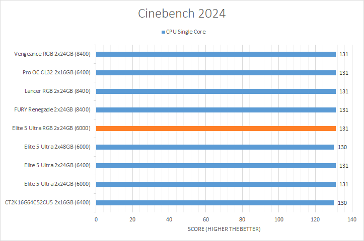 As you can see in our charts above, there was a measurable difference between different RAM models in the CPU Multi Core test, showing a discernible advantage for the DDR5-8400 kits. The Patriot Viper Elite 5 Ultra RGB DDR5-6000 2x24GB came in near the back, which made sense given its rated bandwidth, but otherwise delivered competitive performance against other RAM in its performance class. In the CPU Single Core test, the performance for every tested product was basically identical.