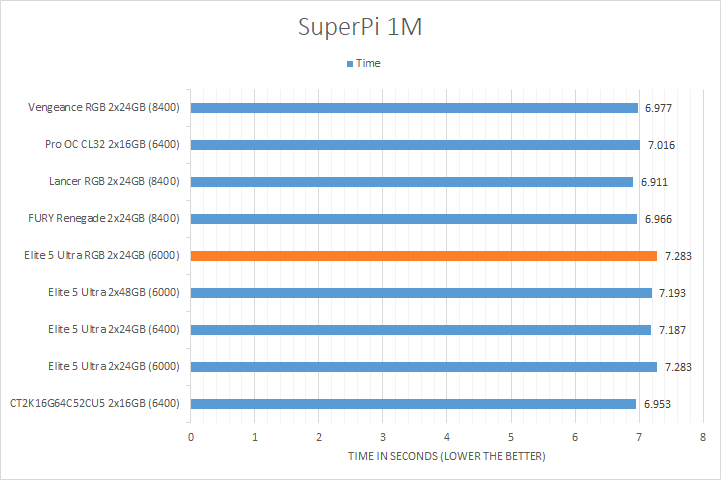 We have always included SuperPi in our benchmark results, because it is a quick and dirty run that always proves to be interesting. It is neither the fastest way to calculate Pi nor is it the most challenging. But being an enthusiast at heart, this program has always provided interesting results for showing off your overclocking prowess on your favorite online outlet. All the results regardless of model and bandwidth were within a hair of each other, but all the Patriot Viper kits were consistently slightly slower than the rest.