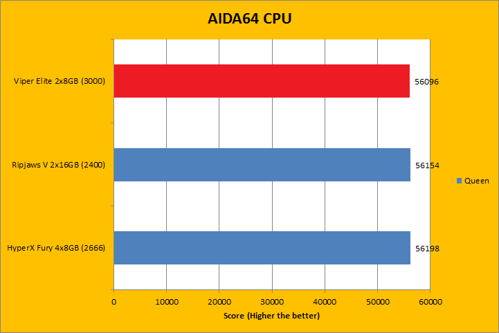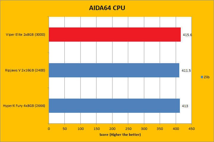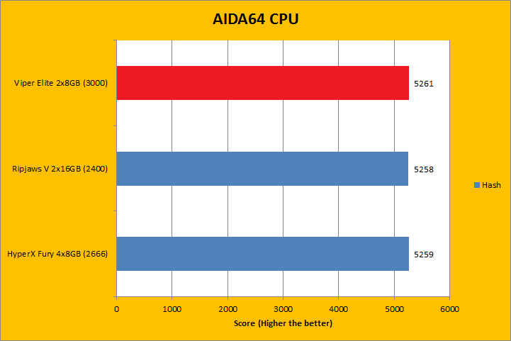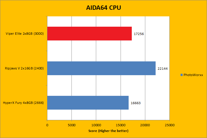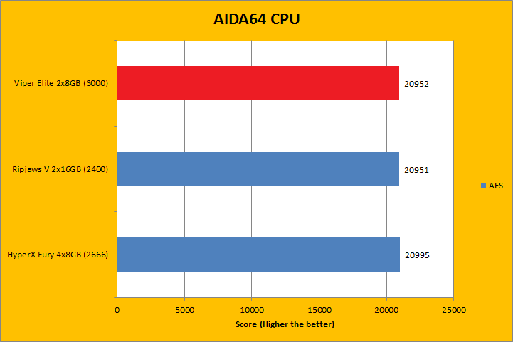 As always, our first set of benchmark results presented on the table are data obtained using AIDA64 CPU tests. Version 5.70.3800 (The latest release at press time; which can be downloaded from our Downloads page) results are comparable to recent previous releases. It was quite interesting how the products compared, because we had a varying combination of speed, capacity, and latencies. As far as how their performance went, all of them were close to each other, with the Patriot Viper Elite PC4-24000 2x8GB sitting at where we expected it to be. AIDA64 did not gain much from stepping up your memory speed, with the exception of the PhotoWorxx results -- where higher bandwidth units clearly had an advantage. However, the higher density 2x16GB kit from G.Skill had the biggest gain despite having the lowest memory bandwidth, as you can see in our graphs above.