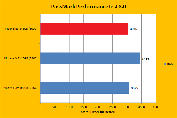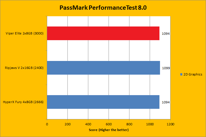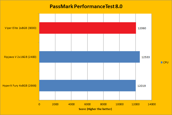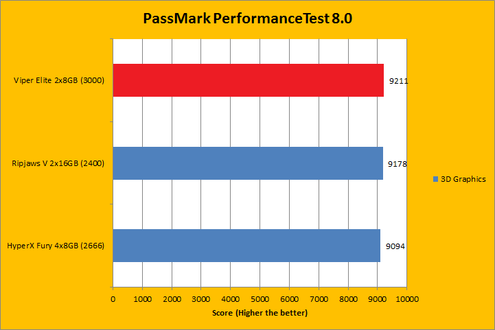 We run PassMark PerformanceTest 8.0 to evaluate four different areas of our system; coming down to the CPU, RAM, 2D Graphics, and 3D Graphics. It takes a somewhat different approach in obtaining results compared to other programs, which is why we like to use it, haha. PassMark Performance Test 8.0's memory benchmarking tool is the only test in our setup that takes memory capacity into account, but it did not seem to account for anything above 16GB. Usually, doubling the RAM will increase the score by about one and a half times, but the 32GB kits here did not rank higher compared to the 16GB kits for its capacity only. Instead, the Ripjaws V 2x16GB won on density, just like it did in the AIDA64 memory tests. Other than that, most of the results were extremely close to each other, with the Patriot Viper Elite PC4-24000 2x8GB kit taking the win in 3D Graphics, tie for second in 2D Graphics, and coming in second place in CPU.