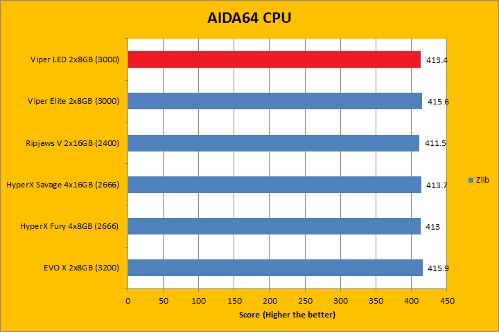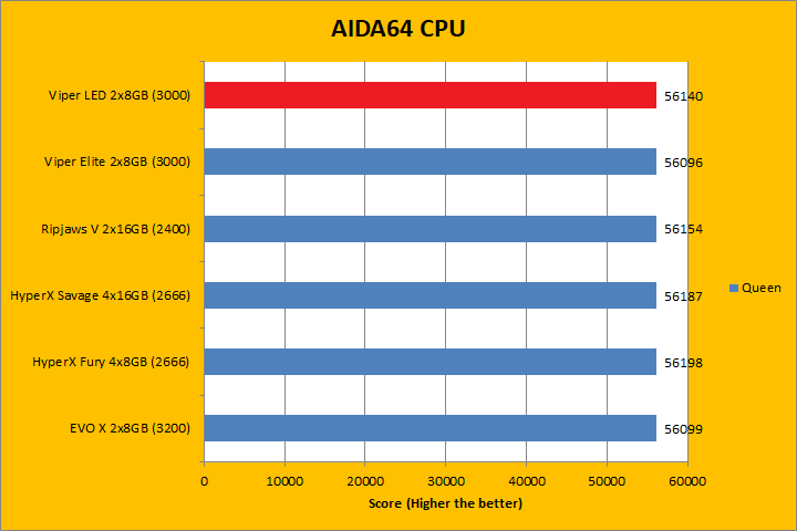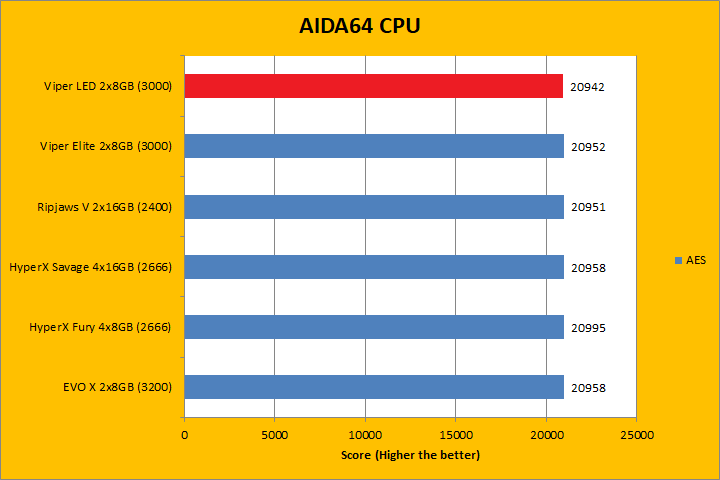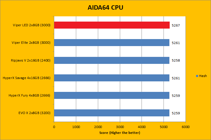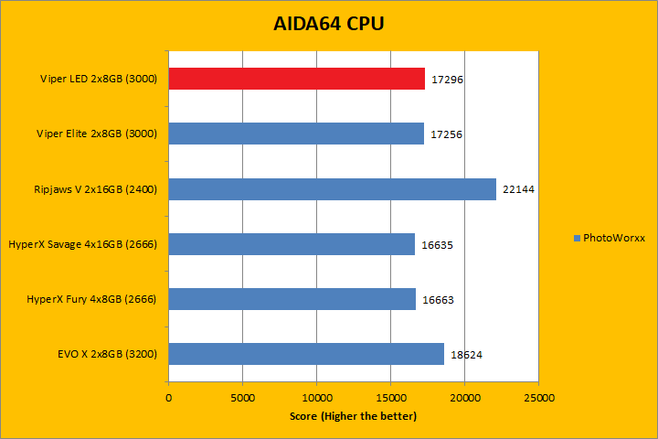 As always, our first set of benchmark results presented on the table are data obtained using AIDA64 CPU tests. Version 5.97.4600 (The latest release at press time; which can be downloaded from our Downloads page) results are comparable to recent previous releases. It was quite interesting how the products compared, because we had a varying combination of speed, capacity, and latencies. As far as how their performance went, all of them were close to each other in most tests, with the Patriot Viper LED PC4-24000 2x8GB sitting at where we expected it to be in relative to the compared kits. AIDA64 did not gain much from stepping up your memory speed, with the exception of the PhotoWorxx results -- where the 2x16GB kit from G.Skill had the biggest gain despite having the lowest memory bandwidth, as you can see in our graphs above. To date, I still cannot explain why it did so well in that test.