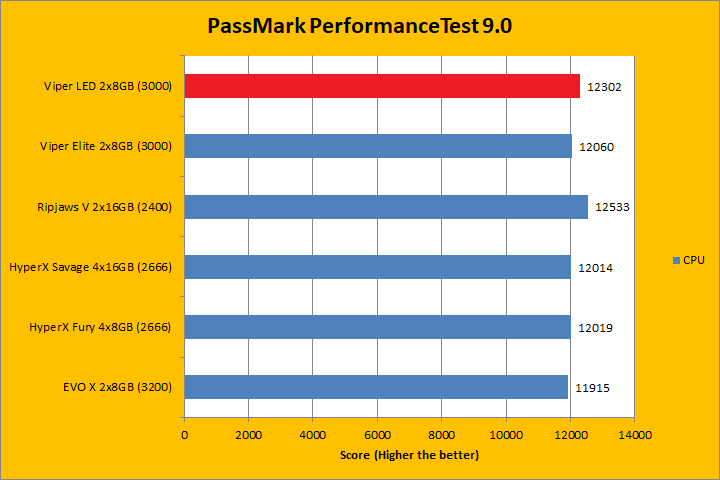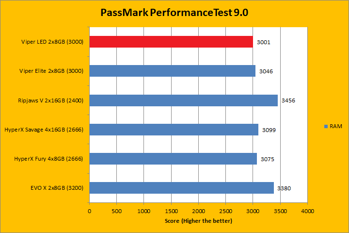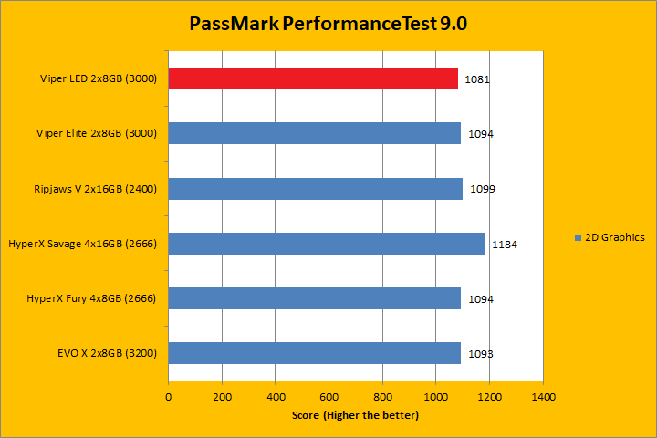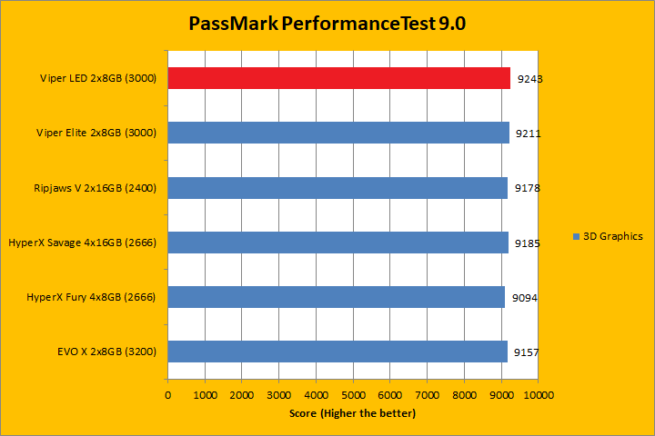 We run PassMark PerformanceTest 9.0 to evaluate four different areas of our system; coming down to the CPU, RAM, 2D Graphics, and 3D Graphics. It takes a somewhat different approach in obtaining results compared to other programs, which is why we like to use it, haha. PassMark Performance Test 9.0's memory benchmarking tool is the only test in our setup that takes memory capacity into account, but it did not seem to account for anything above 16GB. Usually, doubling the RAM will increase the score by about one and a half times, but the 64GB and 32GB kits here did not rank higher compared to the 16GB kits for its capacity. Like it was in AIDA64, the Ripjaws V 2x16GB took home the lead in the RAM benchmark. Other than that, most of the results were extremely close to each other, with the Viper LED PC4-24000 delivering no surprises in the process.
