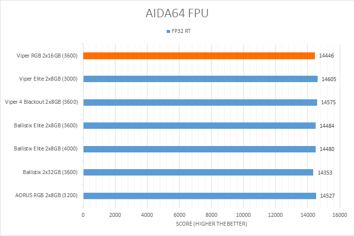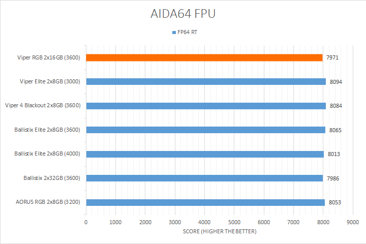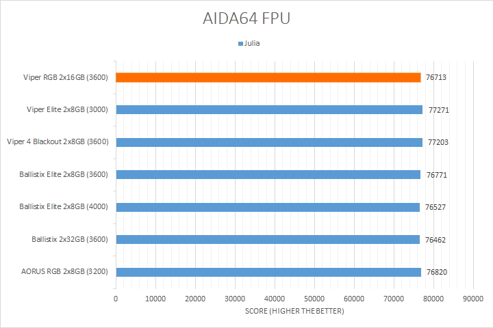 The next tests we have are AIDA64's FPU benchmarks, which are usually the least exciting of all when writing a RAM review. This is because the results obtained are generally more dependent on the tested processor. The outcome of these results is almost irrelevant to the speed or latencies of the installed memory modules. As you can see in our graphs above, all the results were within two percent of each other. The Patriot Viper RGB DDR4-3600 2x16GB dual channel kit scored in the bottom half for most of these tests. Even so, they were all within the same ballpark as each other, so these differences do not really mean much.