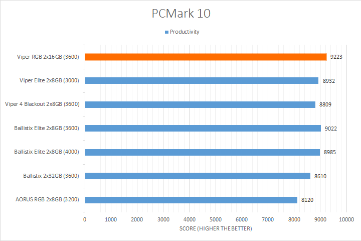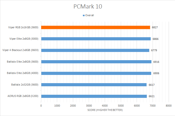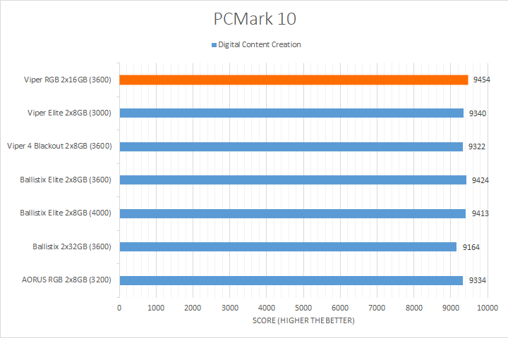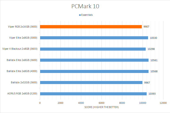 PCMark 10 is the latest version of the popular full system benchmark from UL. A standard benchmark run provides scores in three categories, which includes Essentials, Productivity, and Digital Content Creation. Wrapping up all three categories is an overall score in the end. With the completion of these synthetic simulating real-world behavior tests, the resultant scores show the Viper RGB DDR4-3600 perform in the top half of all of the memory, which is great to see. The higher operating frequency with the relatively lower latency helped, but there is clearly more than just memory frequency at play in these tests. Otherwise, the Patriot Viper RGB DDR4-3600 2x16GB performed decently here. Breaking down the scores, our kit today did not perform well in the Essentials test, but was first in Productivity and Digital Content Creation tests.