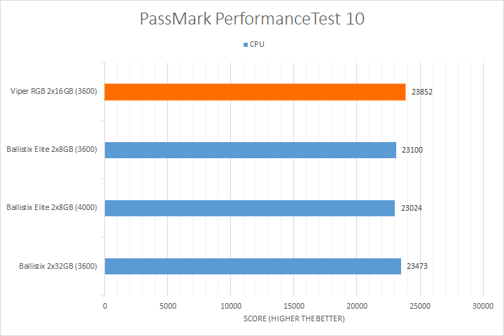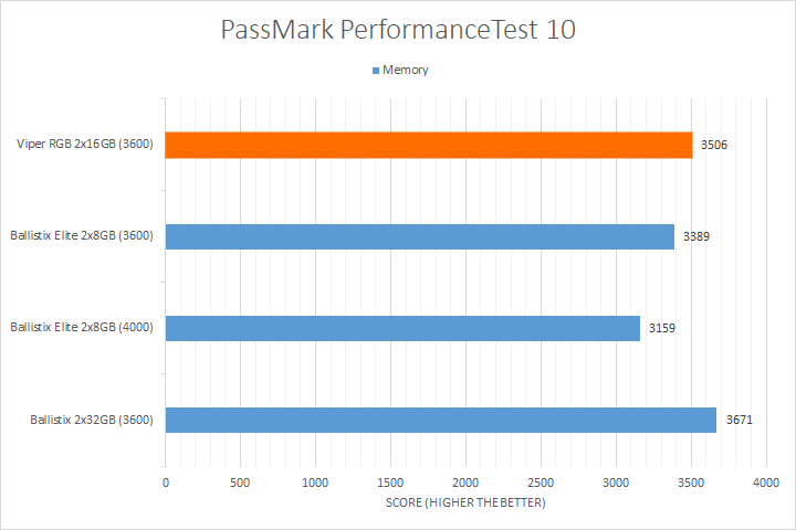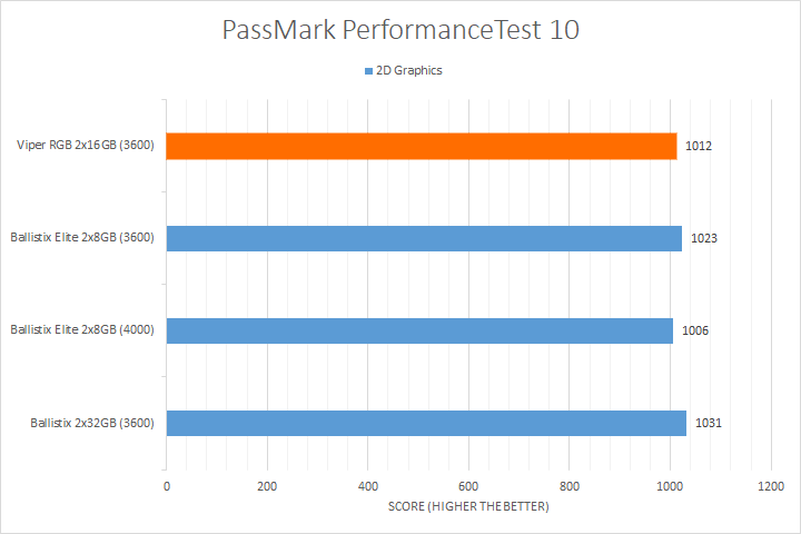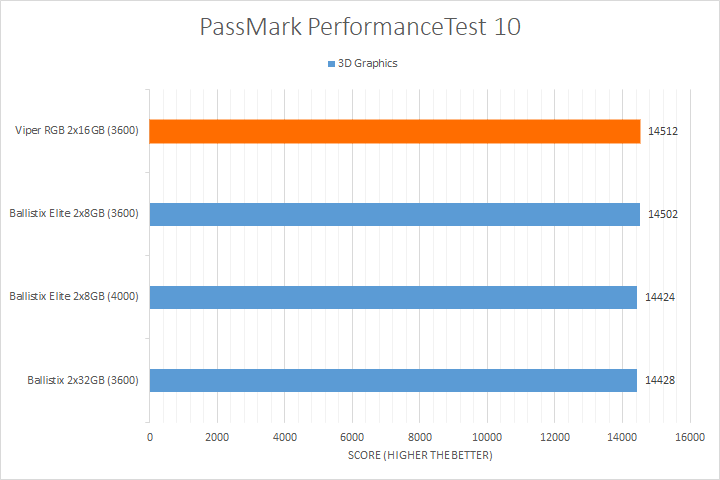 We ran PassMark PerformanceTest 10 to evaluate four different areas of our system; coming down to the CPU, RAM, 2D Graphics, and 3D Graphics. It takes a somewhat different approach in obtaining results compared to other programs, which is why we like to use it. PassMark Performance Test 10's memory benchmarking tool is the only test in our setup that takes memory capacity into account, so comparing this kit with a 16GB and 64GB kit is an interesting but explainable result. As such, the Ballistix DDR4-3600 2x32GB kit took the lead, while the Viper RGB DDR4-3600 2x16GB kit was in second. The other tests were a bit less interesting, as they all performed similarly. The Patriot Viper RGB DDR4-3600 2x16GB performed admirably in these tests too.
