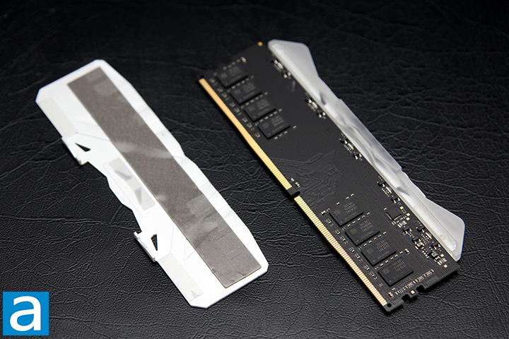 From our above photo, it should also be clearer on how the heatspreaders are designed. After removing the strip at the top, the heatspreaders are bent along the edge at the top and are mirror images of each other. The plastic lighting diffuser clips in between. Since the pieces are made from thin aluminum -- but thick enough to resist easy bending, so it feels solid in the hand -- it does not hold a lot of heat, therefore dissipating the heat energy relatively quickly into the surrounding environment. Either way, you will probably never remove them, since the main selling point of Patriot's Viper RGB are the RGB LED lights. If it does not clear your processor heatsink, then you might as well not buy this kit, haha.