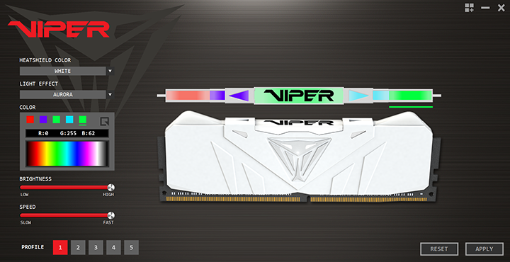 Although the Patriot Viper RGB is compatible with all RGB lighting control software from major motherboard manufacturers such as Gigabyte, ASUS, MSI, and ASRock, the company provides their own software for you to control the RAM as well. Our screenshot above shows Patriot's Viper RGB Memory Software. The Viper RGB Memory Software has a similar graphical user interface to other products from the company like the Patriot Viper V760 we reviewed a few years ago. Overall, the system is quite simple and intuitive. The left pane has the control options for the Patriot Viper RGB's five lighting zones, while the right side is a virtual representation of the memory modules. Here, you can select between lighting effects, pick your color, adjust the brightness, as well as controlling the effect speed. Up to five profiles can be saved as well. The heatshield color option is there for you to select the one corresponding to the kit you own, so the virtual representation on the right is correct. Your heatshield color, in case you are wondering, is not changeable in software, haha.