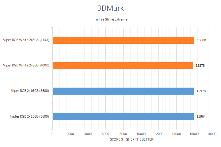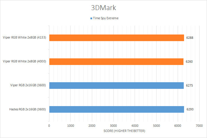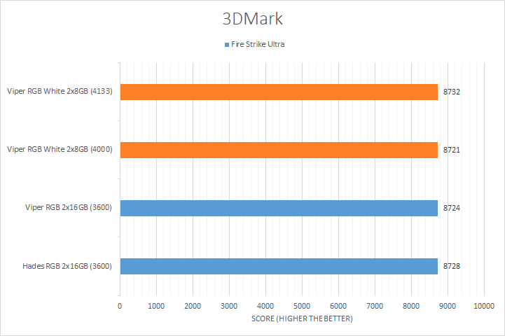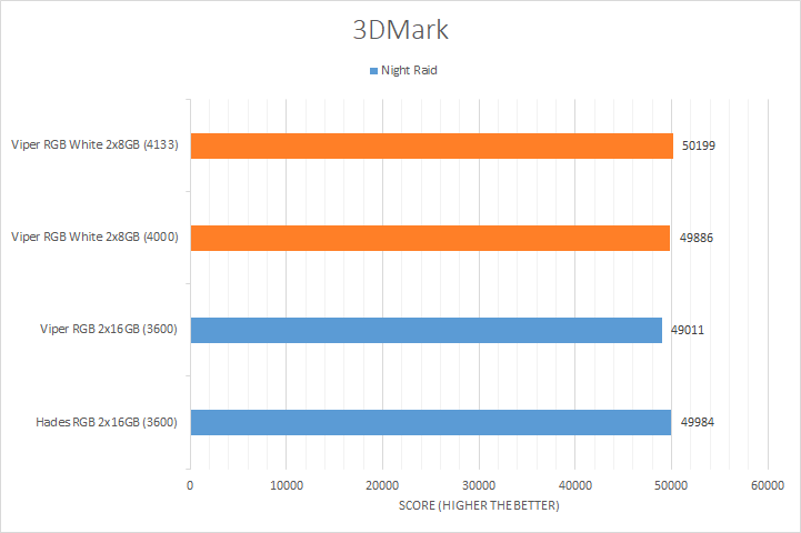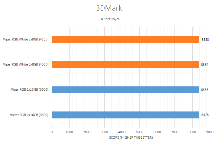 Similar to PCMark 10, UL's 3DMark is a favorite among enthusiasts and reviewers. It has been a part of the APH Networks' battery of standard benchmarks since our start. The latest iteration of 3DMark was used so we included Time Spy Extreme, Port Royal, Fire Strike Ultra and Extreme, and Night Raid. Each of these benchmarks test different capabilities of the GPU, including a ray-tracing benchmark to boot. Even so, all of the results were very close with a greater disparity in our least GPU dependent test, Night Raid. For the most part, the Patriot Viper RGB White operating at DDR4-4133 was at the top for almost all of the results.