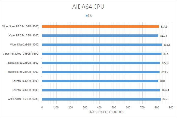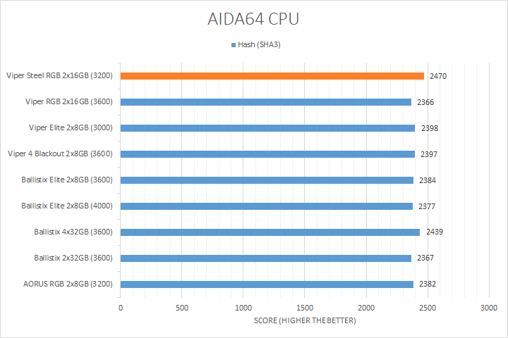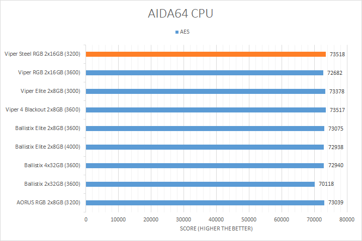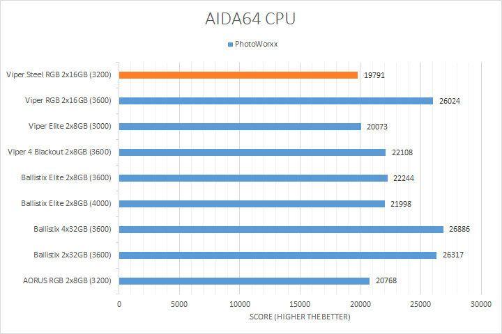As always, our first set of benchmark results presented on the table are data obtained using AIDA64 CPU tests. Version 6.32.5600, the latest release at press time, can be downloaded from our Downloads page. It was quite interesting how the products compared, because we had a varying combination of speed, capacity, and latencies. As far as how their performance went, all of them were close to each other in most tests, with the Patriot Viper Steel RGB DDR4-3200 2x16GB sitting at where we expected it to be in relative to the compared kits. AIDA64 did not gain much from stepping up your memory speed, with the exception of the PhotoWorxx results, where the high density and higher bandwidth Ballistix and Patriot Viper RGB kits took the lead. In fact, the Ballistix 2x32GB kit was 36% faster than the Viper Steel RGB DDR4-3200 2x16GB we are reviewing today in the PhotoWorxx test.