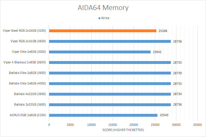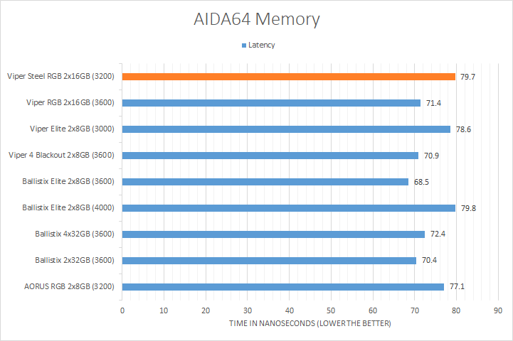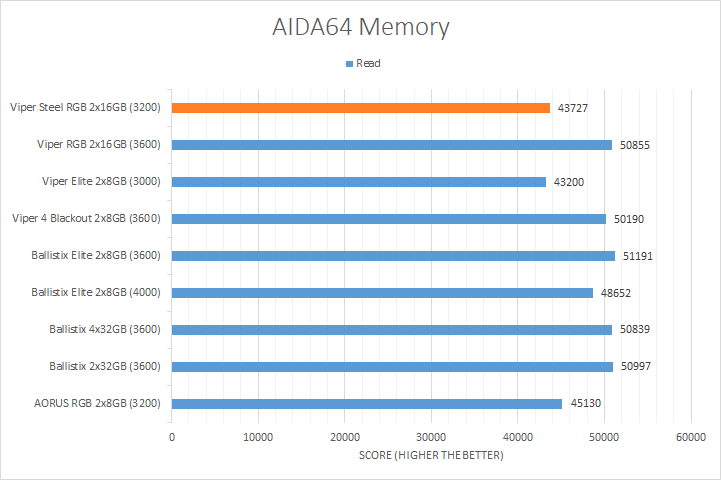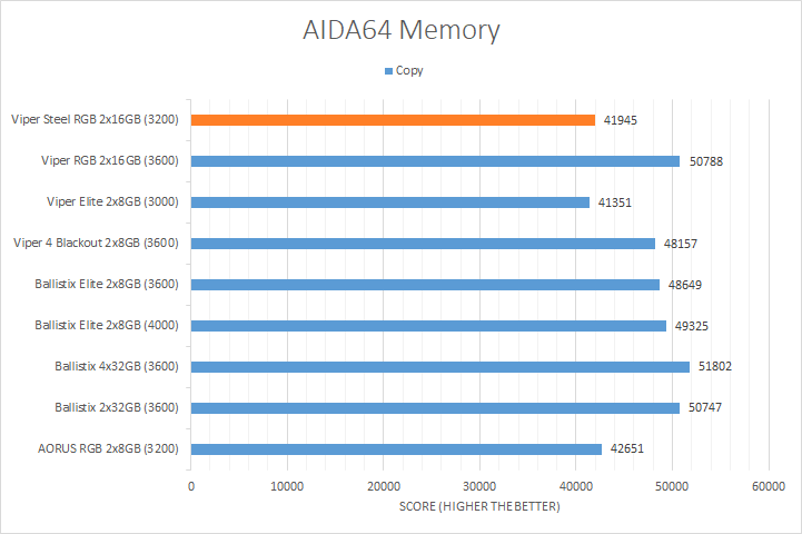 AIDA64's synthetic memory tests are the one next up to produce results for our review today. Traditionally, in pretty much all the benchmarks, see higher memory bandwidth RAM kits are generally favored, whether it is the Copy, Write, or Read results. Operating at DDR4-3200, the Patriot Viper Steel RGB was comparable to other kits at around the same speed, which is not surprising given its rated bandwidth.