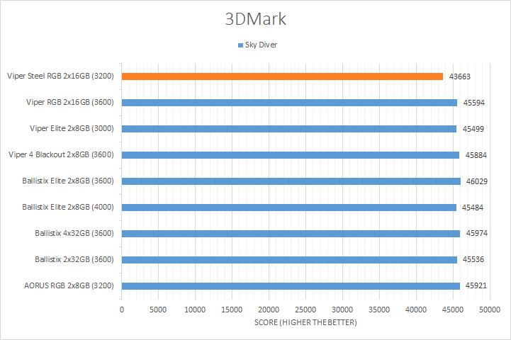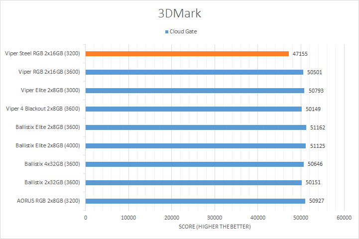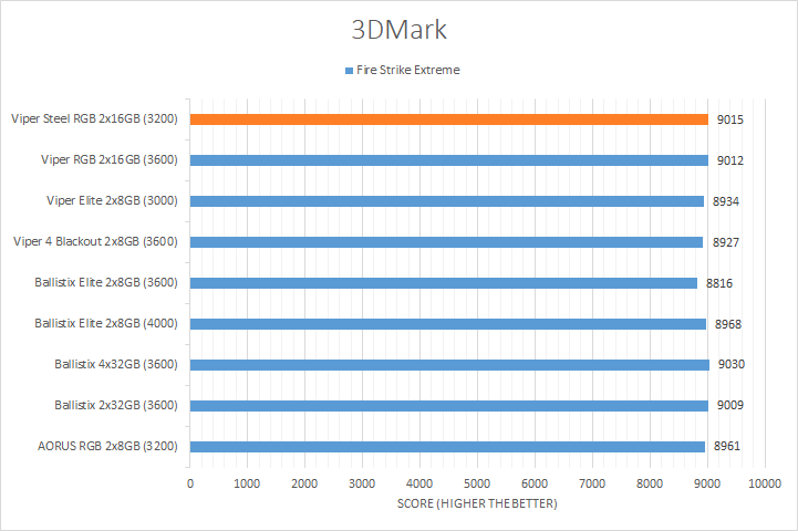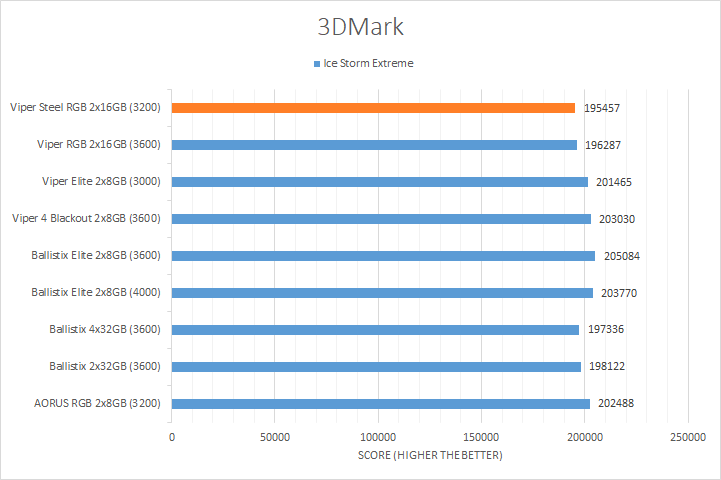 Like UL's PCMark 10 benchmarking suite, 3DMark is yet another favorite among enthusiasts and reviewers alike. In fact, it has been part of the APH Networks' battery of standard benchmarks since the very beginning. The latest iteration of 3DMark is available in a series of presets. We included Fire Strike Extreme, Sky Diver, Cloud Gate, and Ice Storm Extreme; each in decreasing order of GPU dependency for our RAM tests. To give our test platform a little more comprehensive results, I enabled the Extreme option in our tests where possible. As you can see in our graphs above, the Patriot Viper Steel RGB DDR4-3200 2x16GB remained generally consistent with the pack. It came in first in the Fire Strike Extreme test by a few points, but also ended in last place by varying margins in the rest.