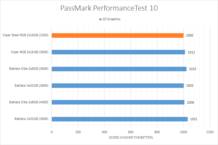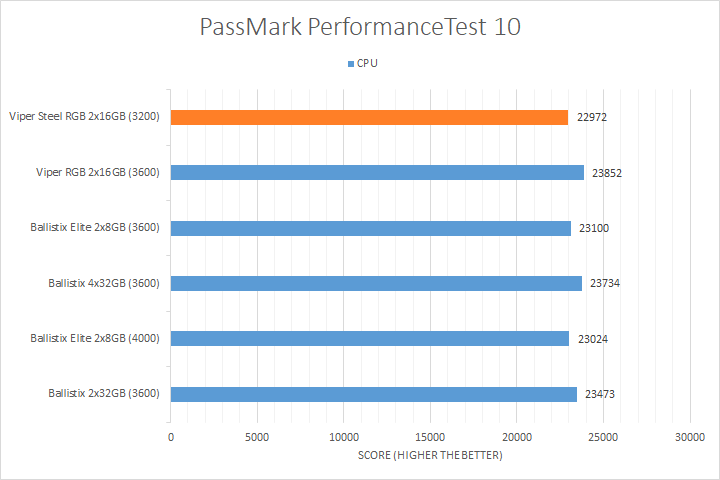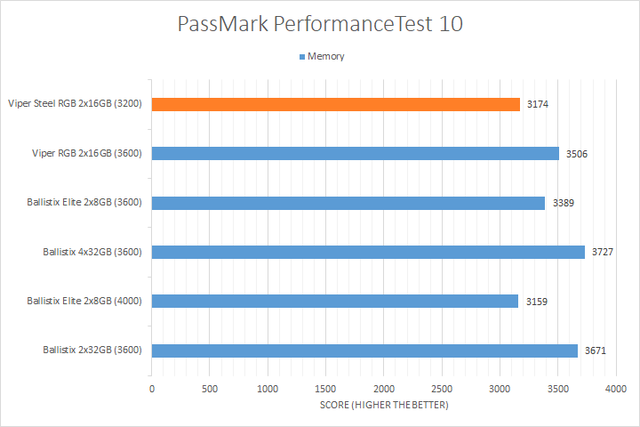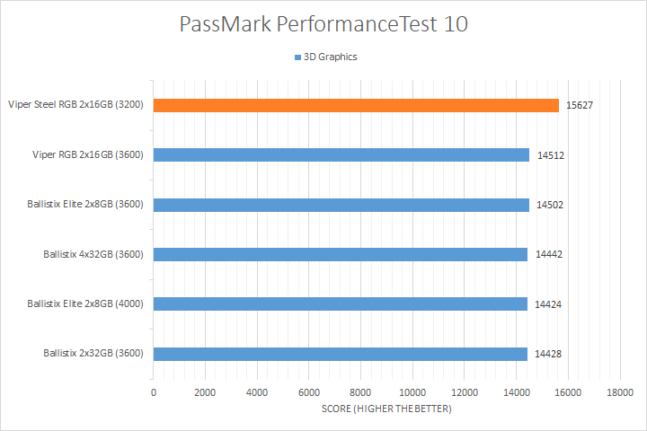 We run PassMark PerformanceTest 10 to evaluate four different areas of our system; coming down to the CPU, RAM, 2D Graphics, and 3D Graphics. It takes a somewhat different approach in obtaining results compared to other programs, which is why we like to use it, haha. PassMark Performance Test 10's memory benchmarking tool is the only test in our setup that takes memory capacity into account, but it did not seem to account for anything above 16GB. Usually, doubling the RAM will increase the score by about one and a half times, but the 32GB kits here did not rank higher compared to the 16GB kits for its capacity. That said, the Ryzen-favorite DDR4-3600 speed did the best compared to the DDR4-3200 kit we have today. Other than that, most of the results were reasonably close to each other, with the Patriot Viper Steel RGB DDR4-3200 2x16GB taking home the win in the 3D Graphics test.