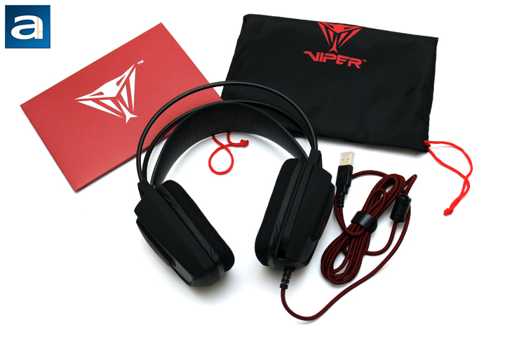Out of the box, there are a few things to note. Obviously, there is the Patriot Viper V360 itself, and this is twist-tied to a clear plastic shell. A medium sized red envelope is found with some documentation and information about general use and warranty. For your information, Patriot offers a two year warranty for this gaming headset. Finally, a black felt drawstring bag is found, with Viper branding pasted on the front. I am really glad to see a bag for users to pop their pair of cans into. Even though it may seem like a small addition, it is a very useful one, especially for those on the go. Otherwise, let us take a closer physical look at the Viper V360 itself.