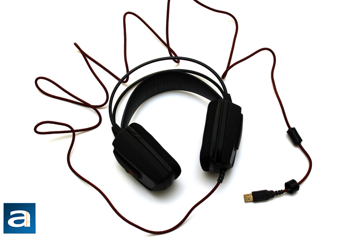 Starting as I always do with headphone reviews, at the bottom of the Patriot Viper V360 is a gold plated USB 2.0 connector, and this powers and manages the audio connections to the computer. Unfortunately, this means the Viper V360 is ruled out for mobile usage. However, this is understandable considering the need to power the LED lights, in addition to some other features I will mention later in the review. The plug is a standard rubber end, and it provides enough grip to easily pull out of your port when necessary. A red and black braided cable connects the plug all the way up to the headset. Some review sites have reported a bit of fraying of their cable, but I can say this is not the case with my Patriot Viper V360. The cable is quite long at a measurement of approximately 2.2m. This means I can plug it into the back of my computer tower, and use it with no issue. The cable routes all the way to the left side of the Viper V360, and is reinforced with rubber to increase flexibility.