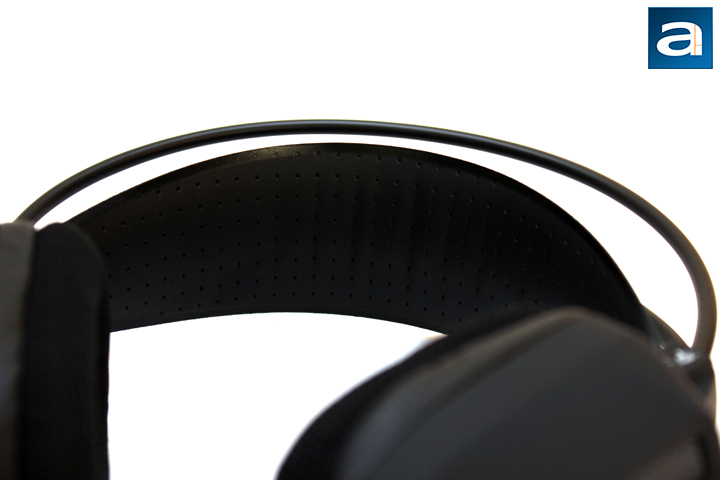 Connecting the two ears together are mainly two large metal wires, wrapped in a soft-touch rubber for aesthetics reasons. Unfortunately, the ears are not connected on any sort of swiveling mechanism, thus it is not necessary the most flexible pair of headphones. When you put the Patriot Viper V360 on, the top of your head will not meet with the two curved wires, but rather a suspended headband. This is wrapped in a leather like material, and offers a bit of padding. With this suspended headband, the V360 adjusts automatically to the user. One thing I should note is this suspended headband seems to be improved over the last one I tried from SteelSeries on their Siberia V3 Prism, as the headband does not try to return to its "equilibrium" state of not being extended. I never had to readjust the headband to keep noise in while I was using the Viper V360. The headband on the top is also dimpled for reasons I do not really know. Maybe they were inspired by the Samsung Galaxy S5. On the flip side there is the name "Viper" embossed into the headband.